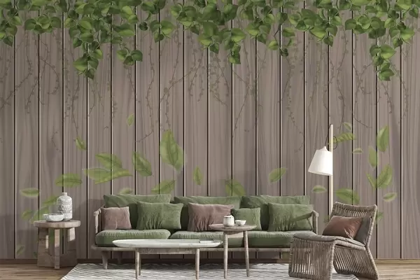 Fotobehang Imitatiehouten planken met hangende bladeren N° w04603
