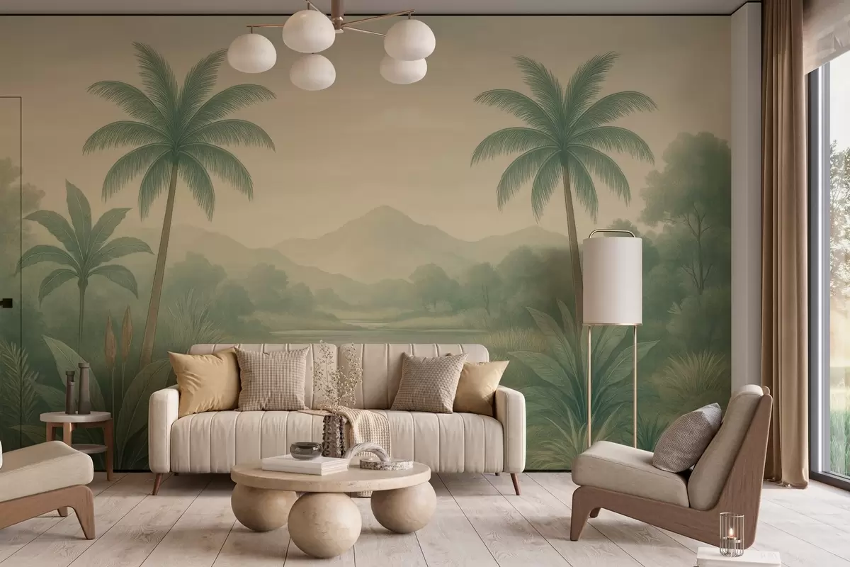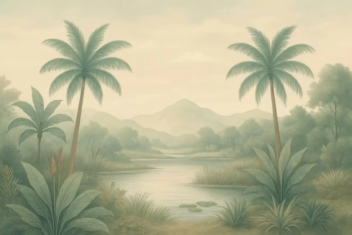 Fotobehang tropisch landschap met palmbomen en een rivier N° w04623