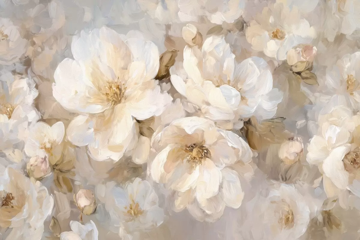 Fotobehang grote bloemen in witte en beige tinten in de stijl van een olieverfschilderij N° w04633