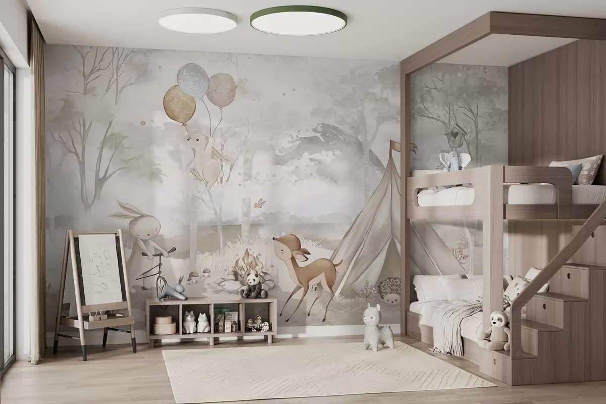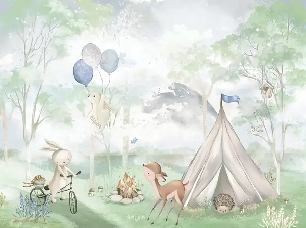 Fotobehang Kinderkamp in warme beige tinten, tent en bosdieren N° w04671