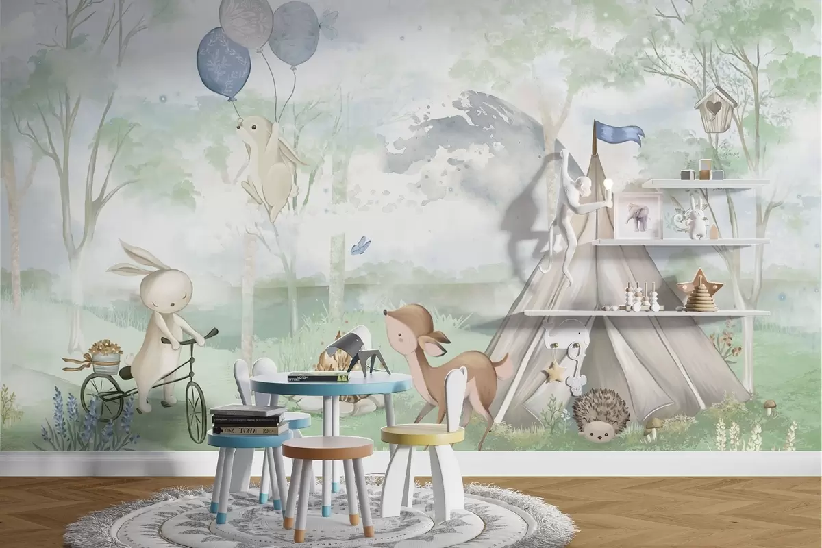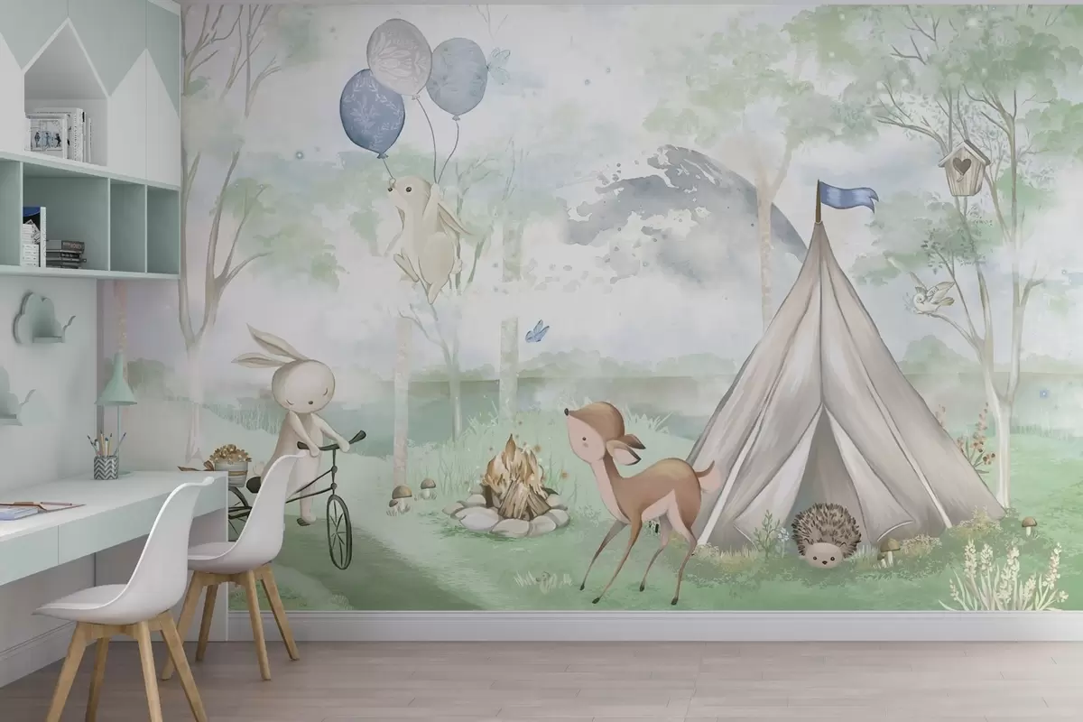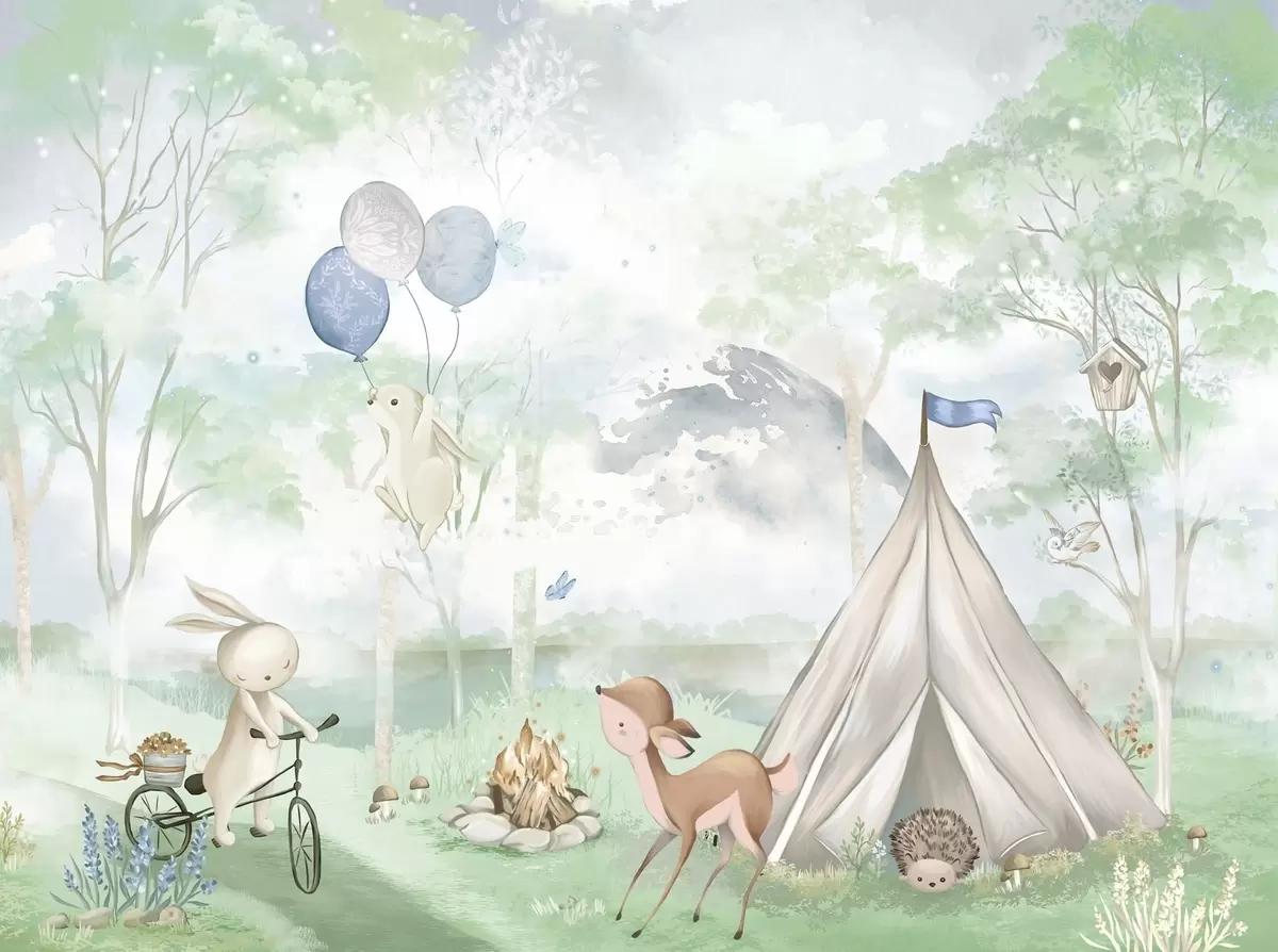 Fotobehang Bospopulaire kinderactiviteit: konijntjes, reeën, tent en kampvuur N° w04671v1