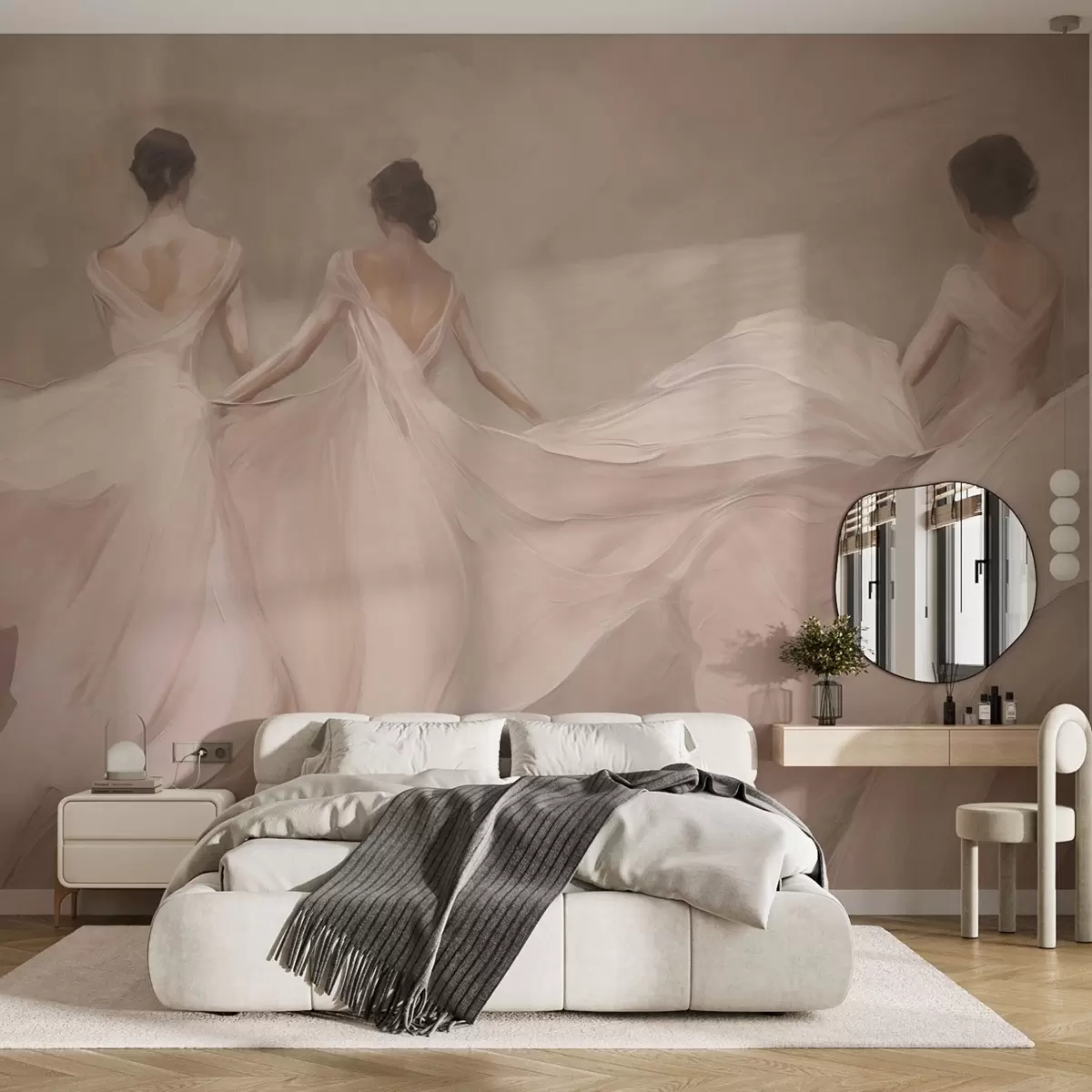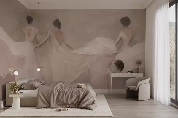 Fotobehang Drie vrouwen in roze jurken, soepel vallende stof, zachtheid N° w04709
