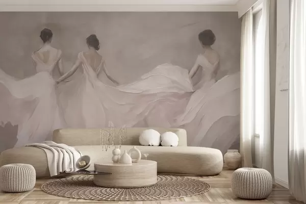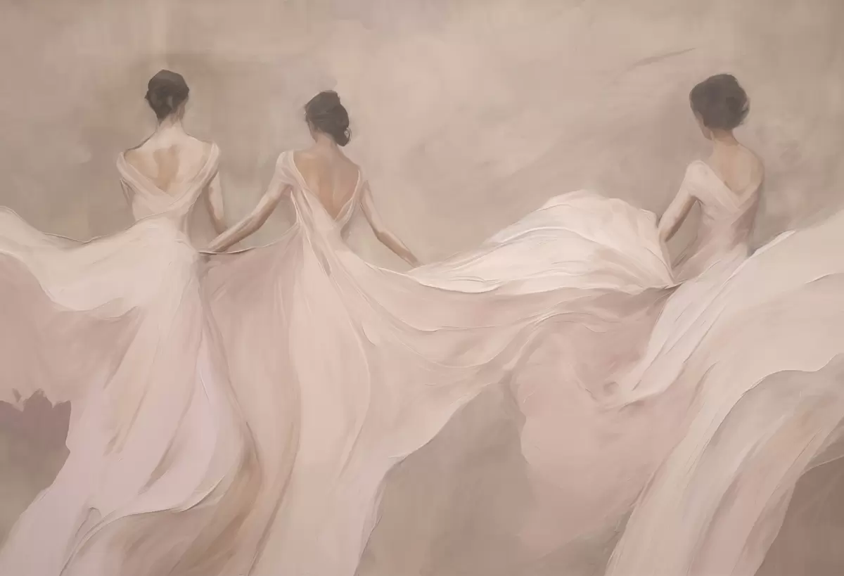 Fotobehang Drie vrouwen in roze jurken, soepel vallende stof, zachtheid N° w04709