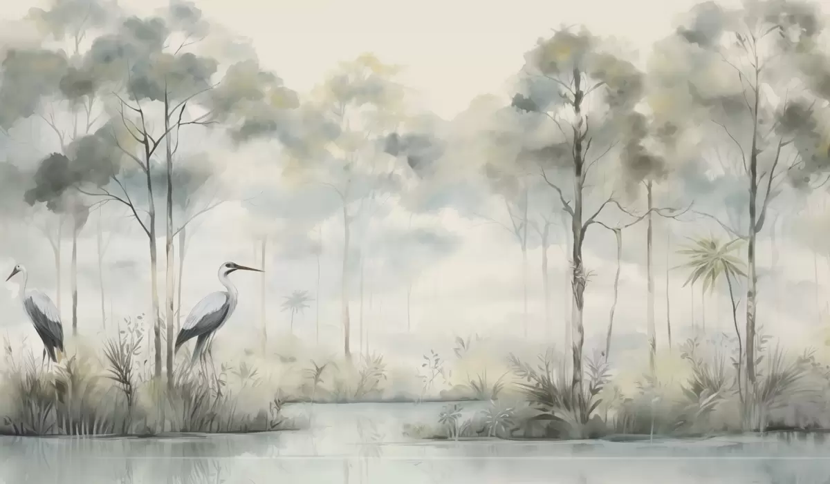 Fotobehang Mistig bos aan het water met reigers, zacht koel kleurenpalet N° w04788