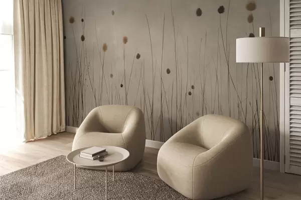 Fotobehang Dunne grassen en pluizige zaadkoppen op een warme beige achtergrond N° w04793