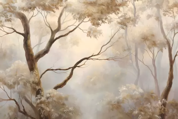Fotobehang Het bos in de lichte ochtendmist. Een delicaat sfeervol schilderij in de stijl van een artistiek landschap. N° w04817
