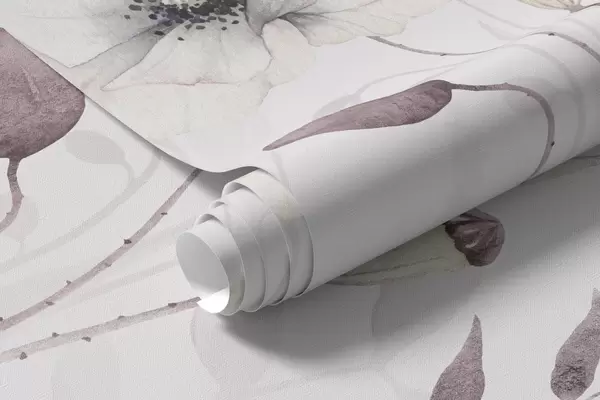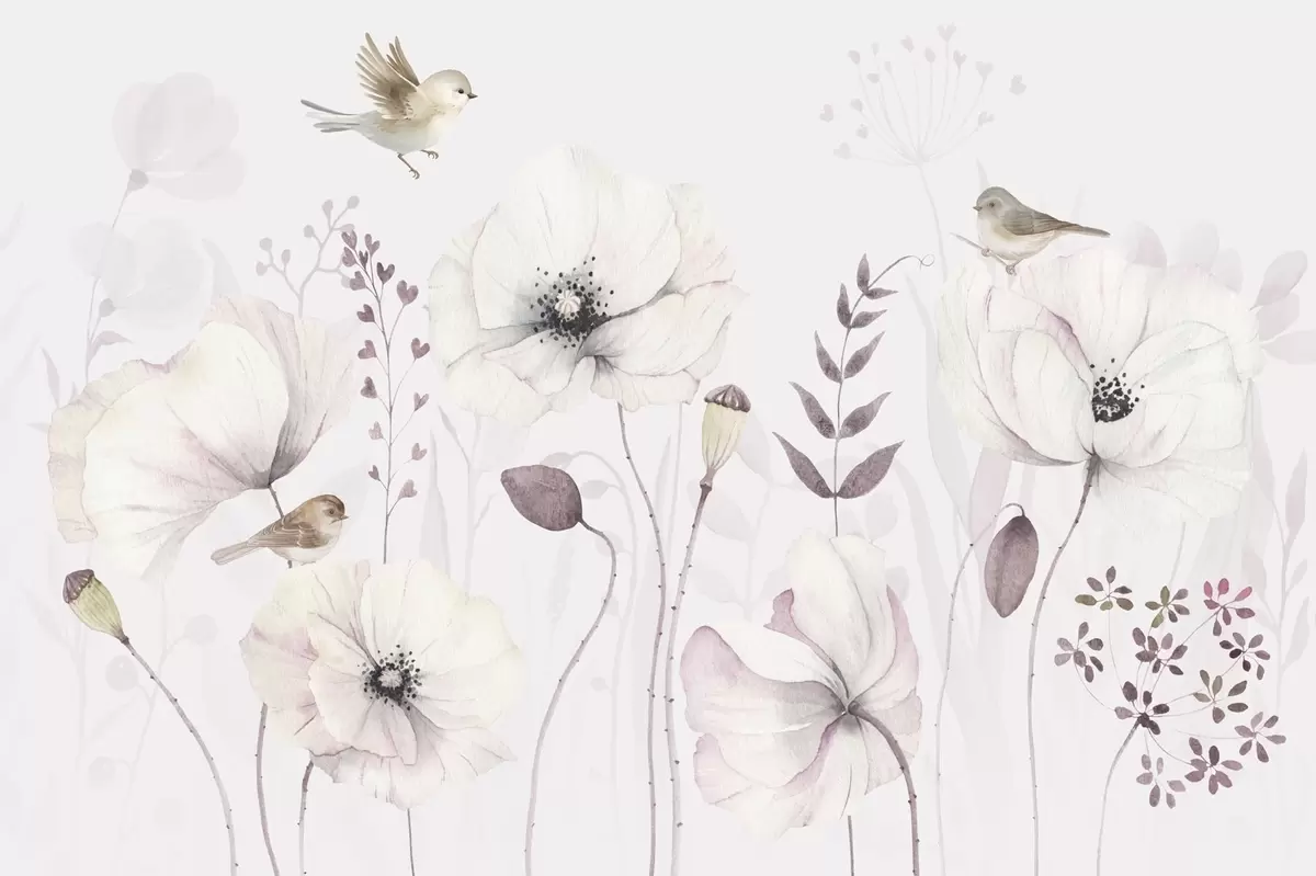 Fotobehang Aquarel papavers met kleine vogels in zacht mauve N° w04861