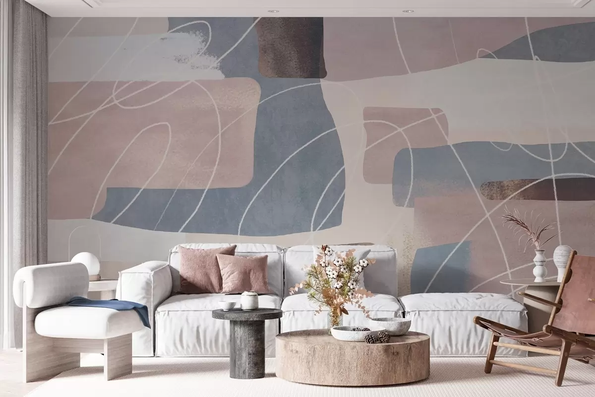 Fotobehang moderne abstractie in tinten poederroze, grijsblauw, beige en bruin N° w04877