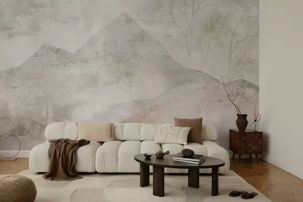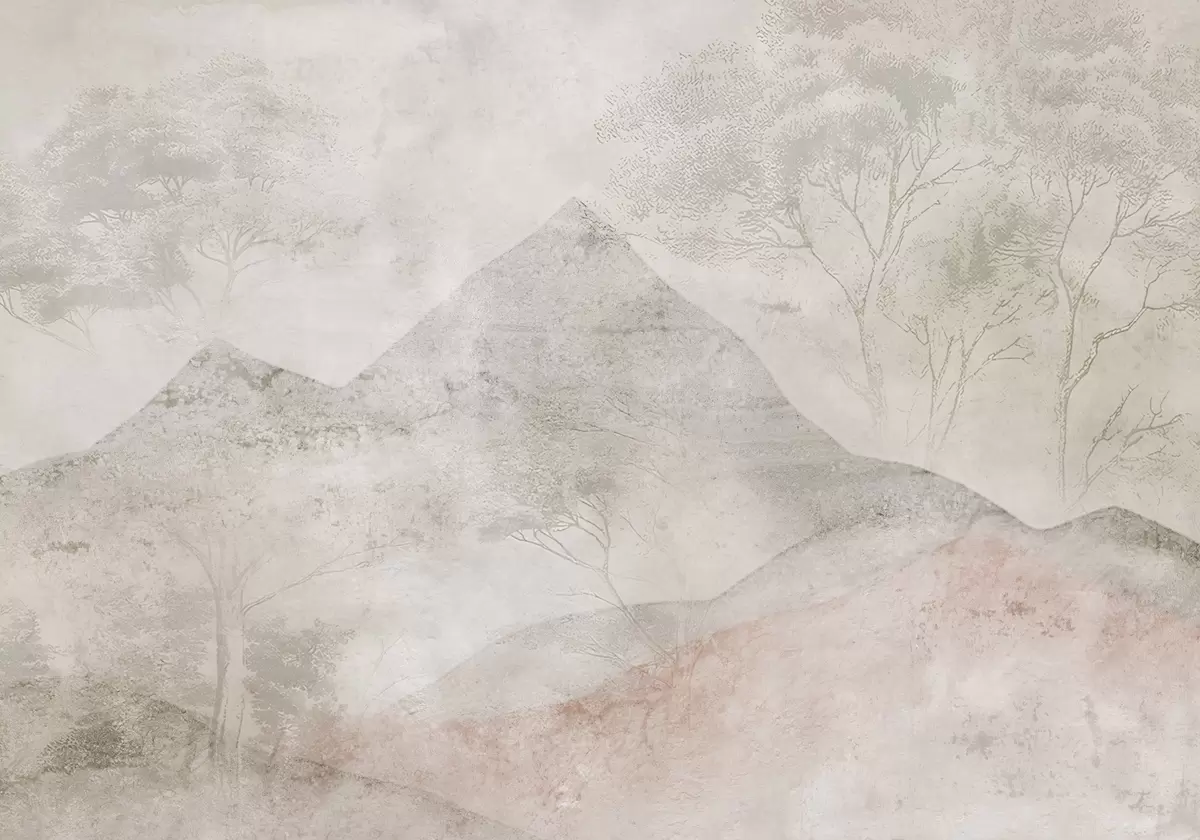 Fotobehang Zachte pastelkleurige bergen en bomen in lichte mist N° w04954