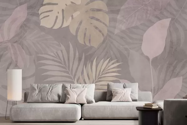Fotobehang gestructureerde tropische bladeren op een grijze achtergrond N° w05063v1