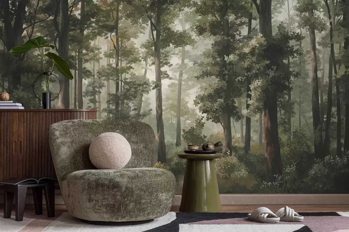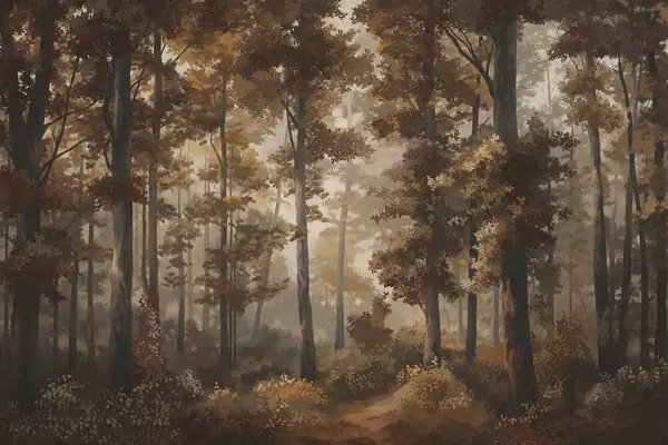 Fotobehang Bosillustratie met mist, hoge bomen en een pad N° w05089