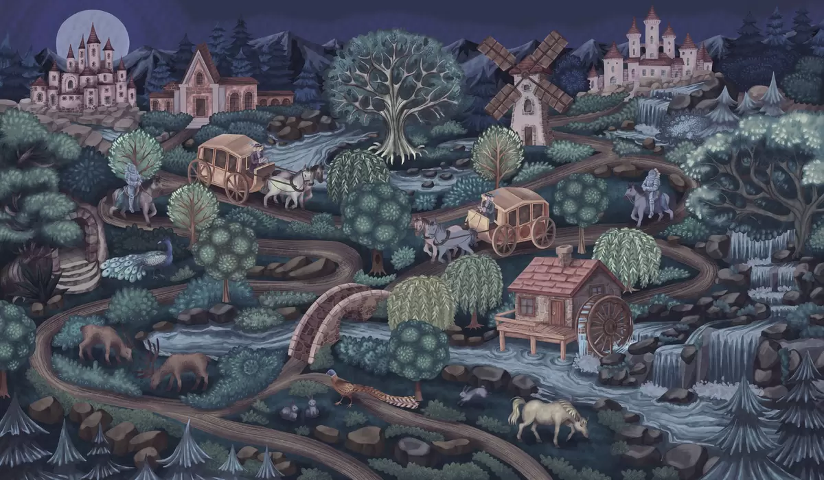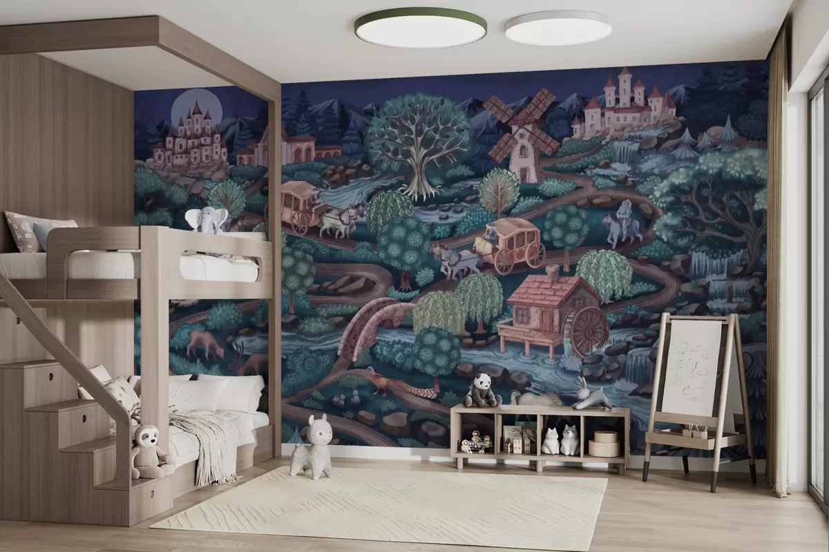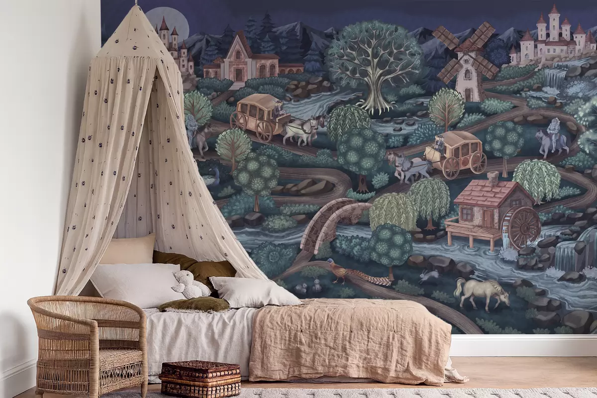 Fotobehang Nachtelijke sprookjesachtige scène met kastelen, molens en bos N° w05091