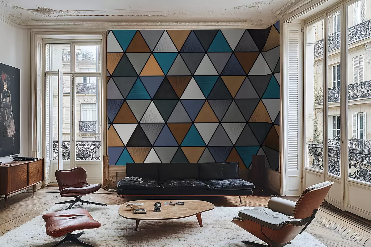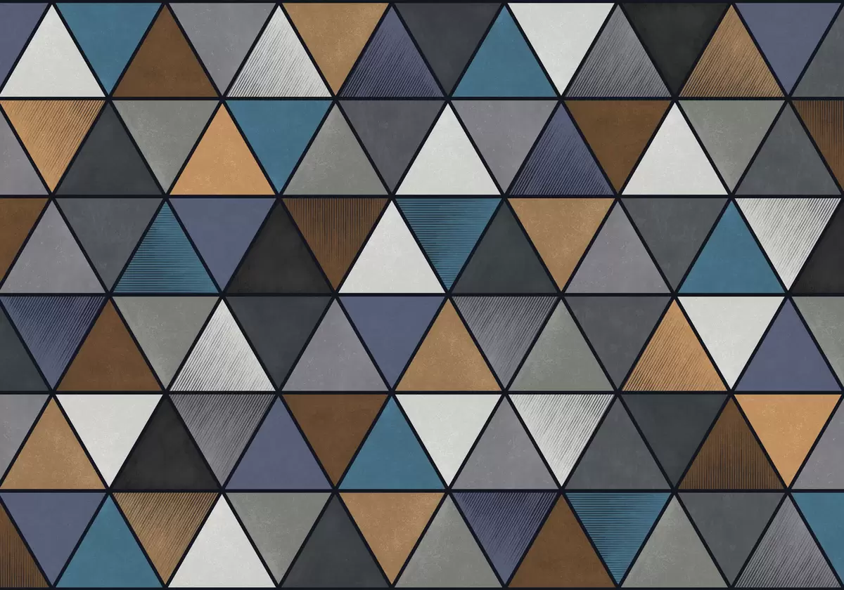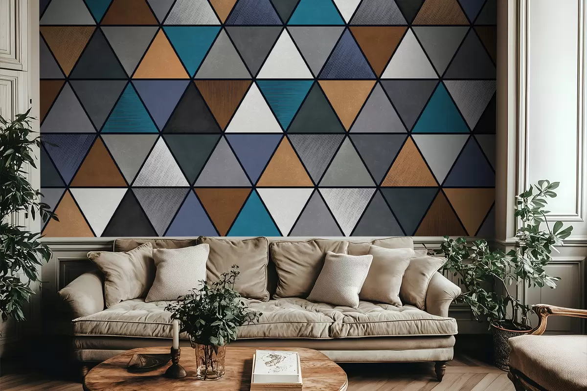 Fotobehang Driehoekig geometrisch patroon in blauw en warme tinten N° w05095