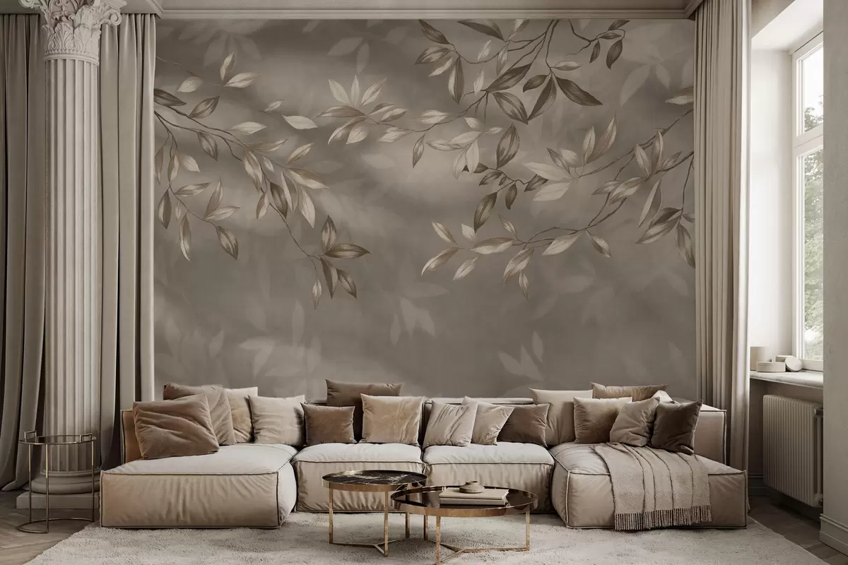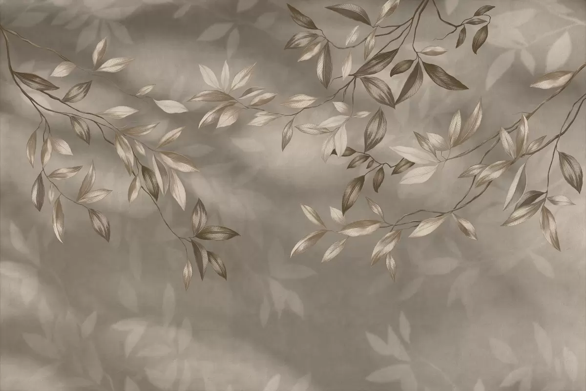 Fotobehang Delicate bladrijke takken in beigetinten op een lichte achtergrond N° w05113v2