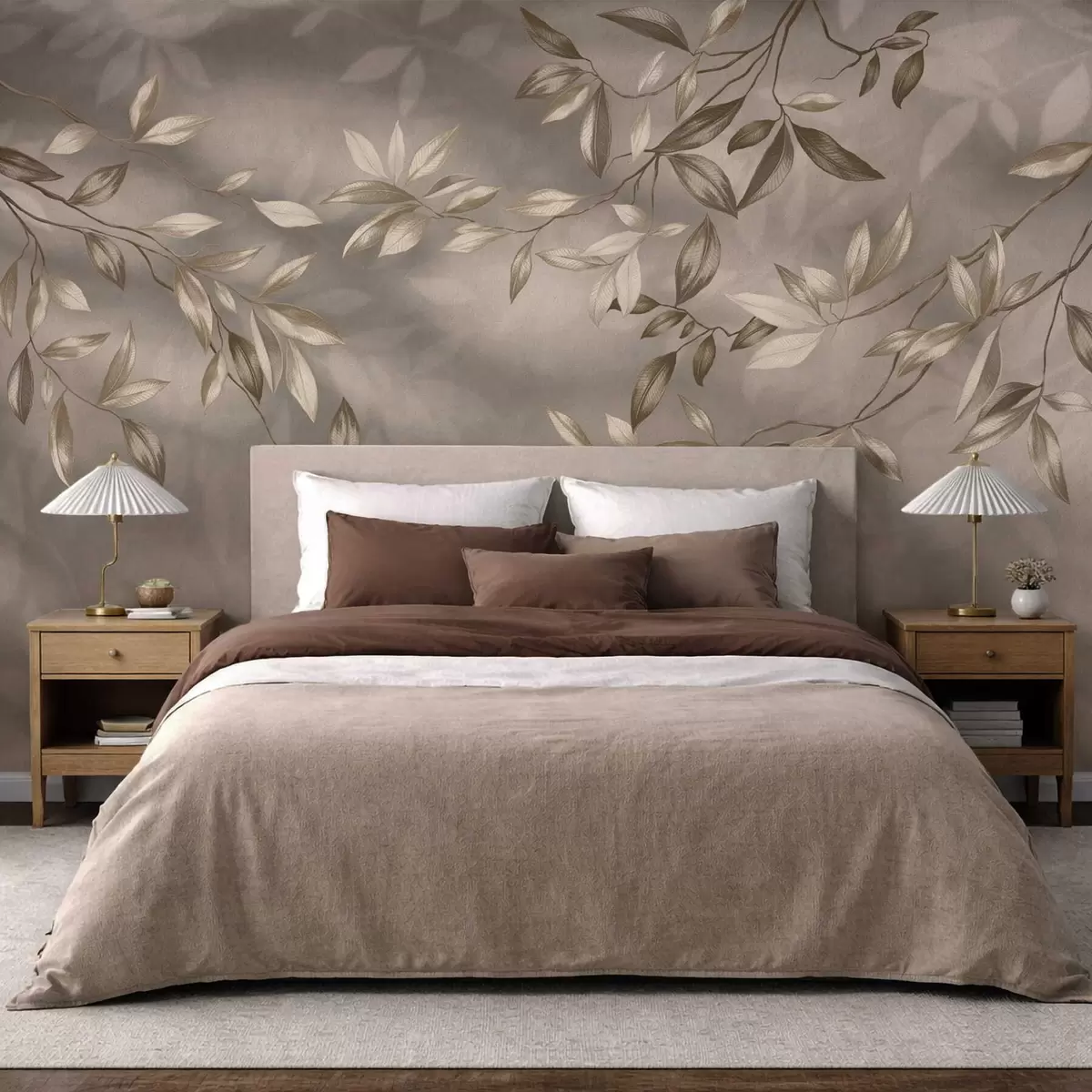 Fotobehang Delicate bladrijke takken in beigetinten op een lichte achtergrond N° w05113v2