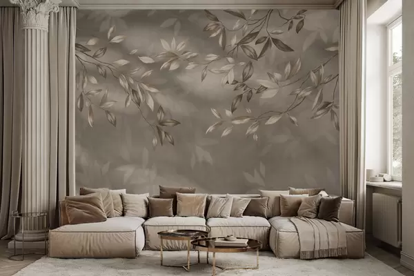 Fotobehang Delicate bladrijke takken in beigetinten op een lichte achtergrond N° w05113v2