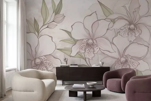 Fotobehang Illustratie van bleke orchideeën met bladeren op een beige achtergrond N° w05117