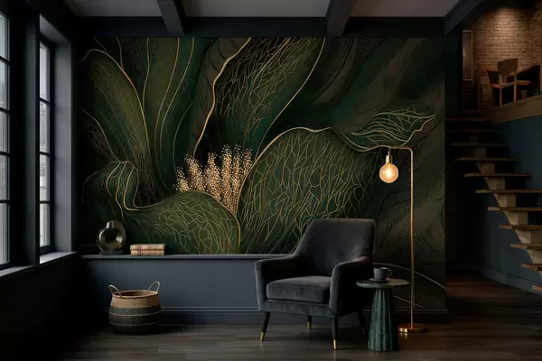 Fotobehang Donkergroene abstracte bloem met fijne lijndetails N° w05119v1