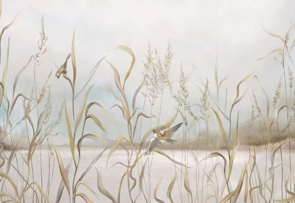 Fotobehang Illustratie van riet en vogels aan het water in zachte tinten N° w05125