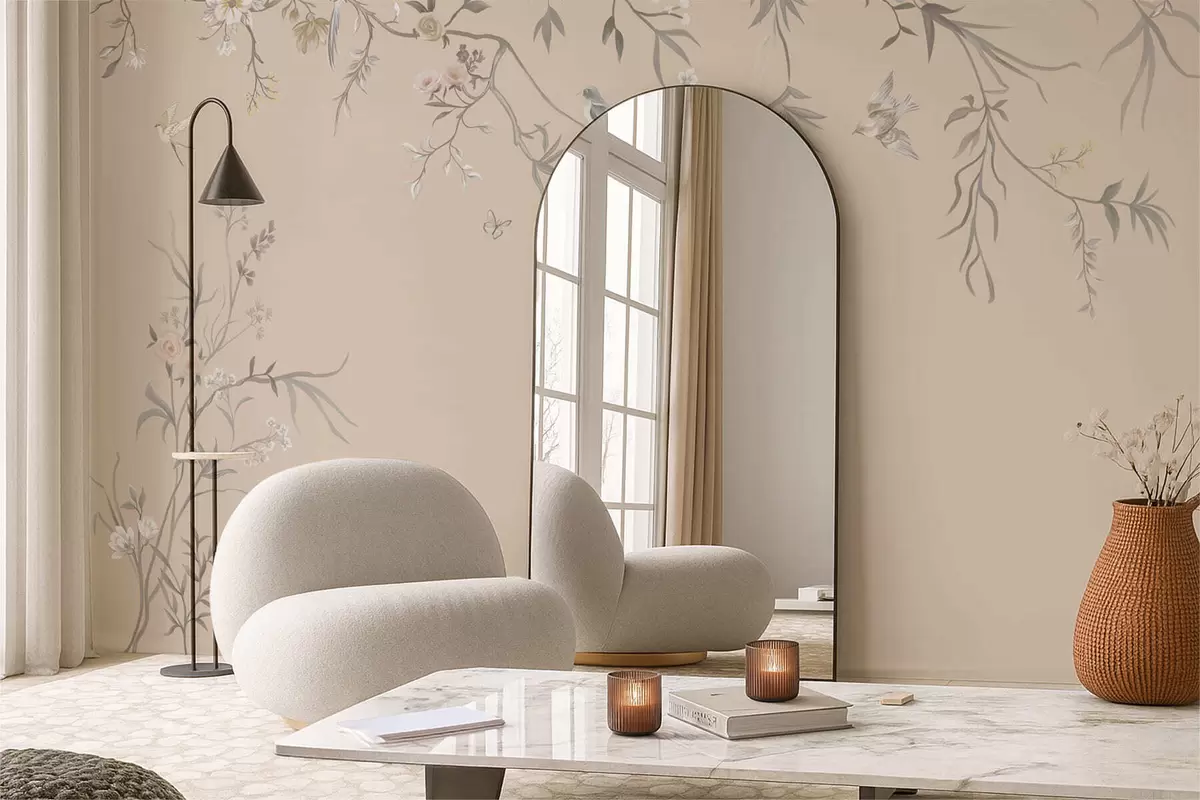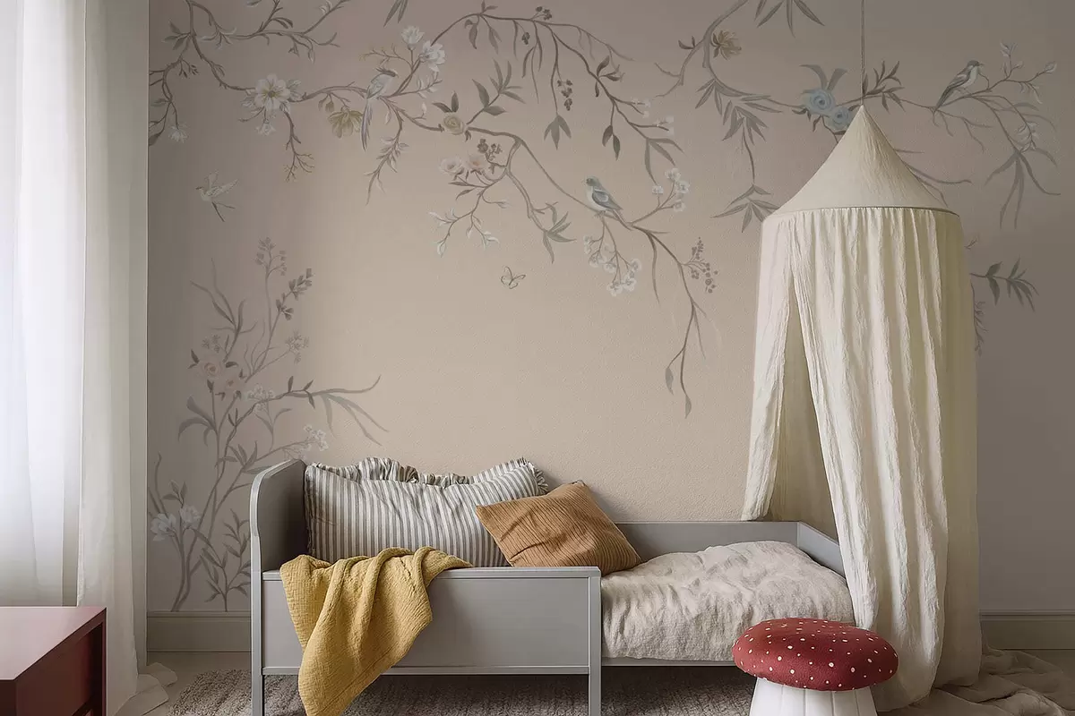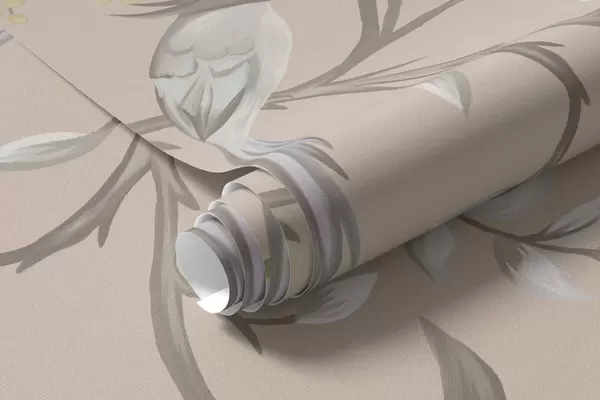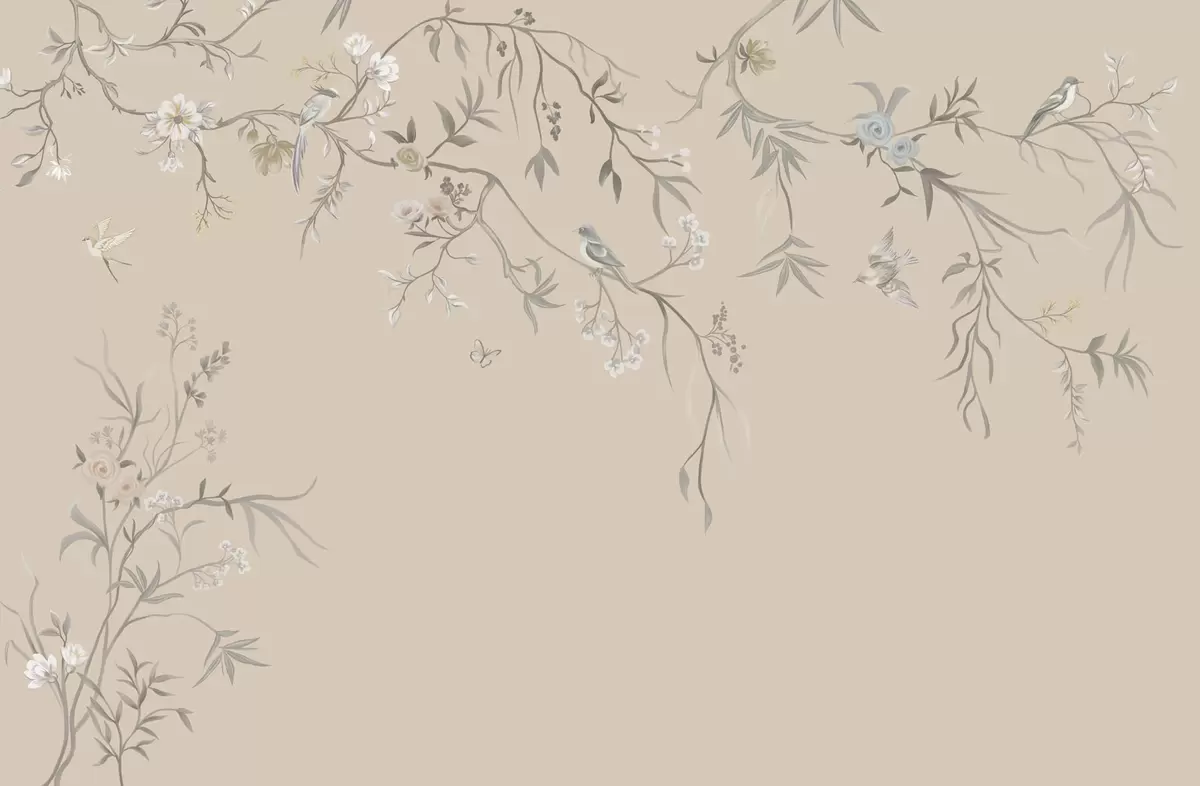 Fotobehang Bloemtakken met vogels op een warme beige achtergrond N° w05127v1
