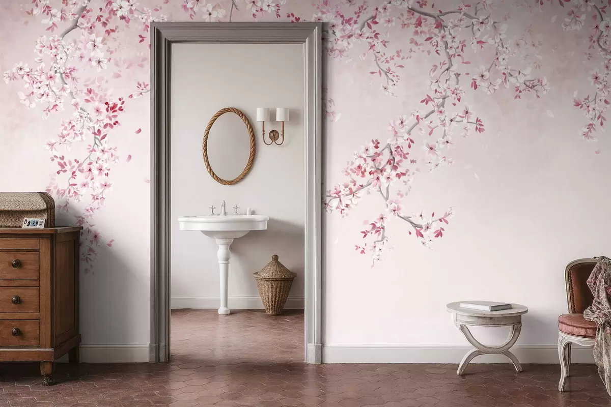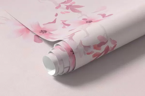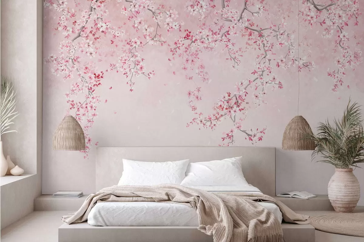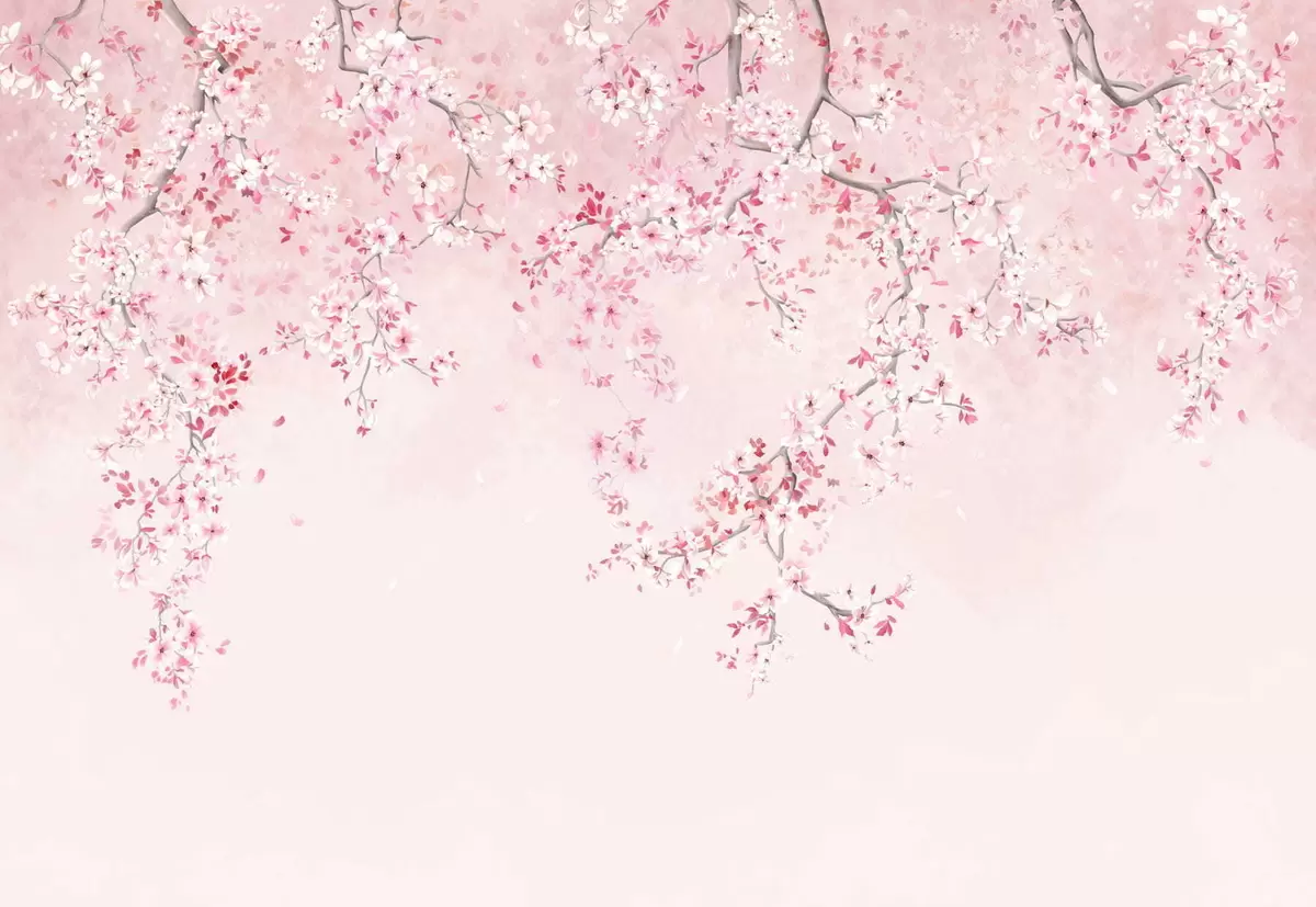 Fotobehang Takken met roze bloesems op een zachte pastelkleurige achtergrond N° w05129v1