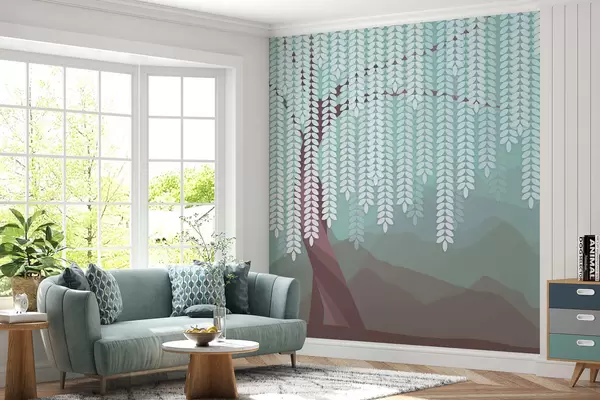 Fotobehang Gestileerde wilg met hangende bladeren tegen een achtergrond van minimalistische bergen in chocoladebruine en turquoise tinten. N° w05232v1
