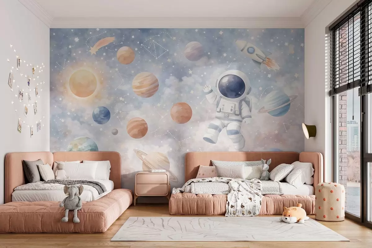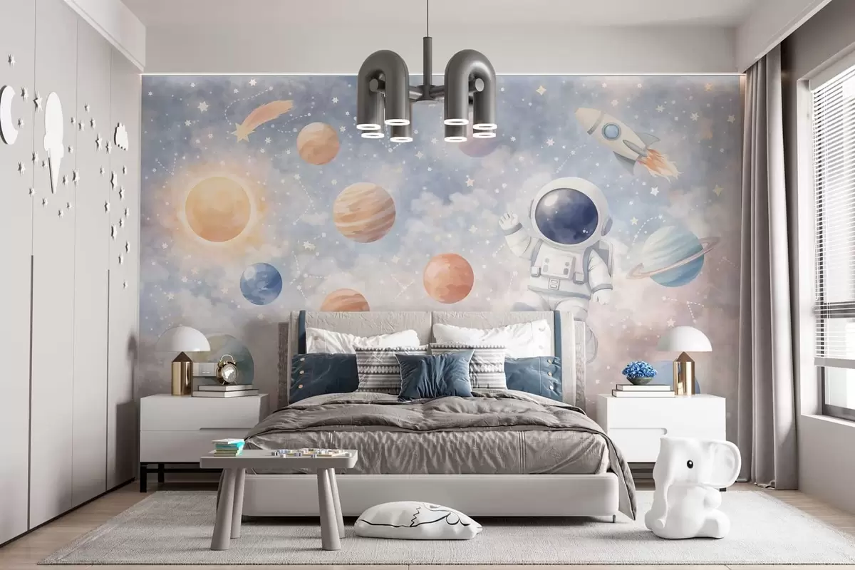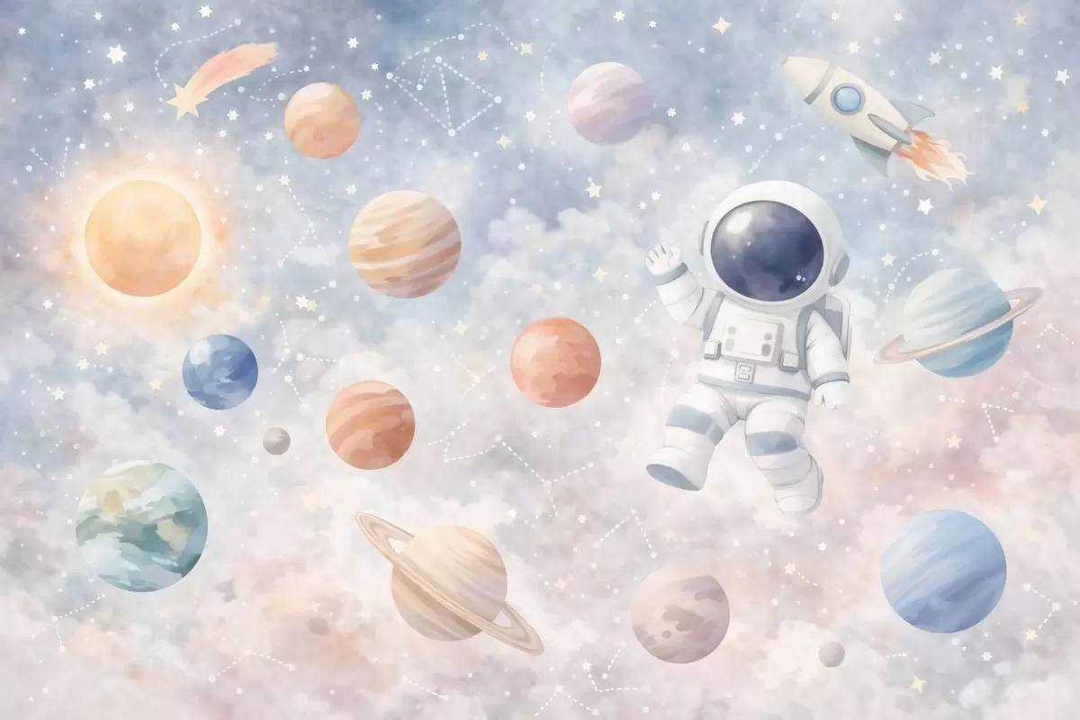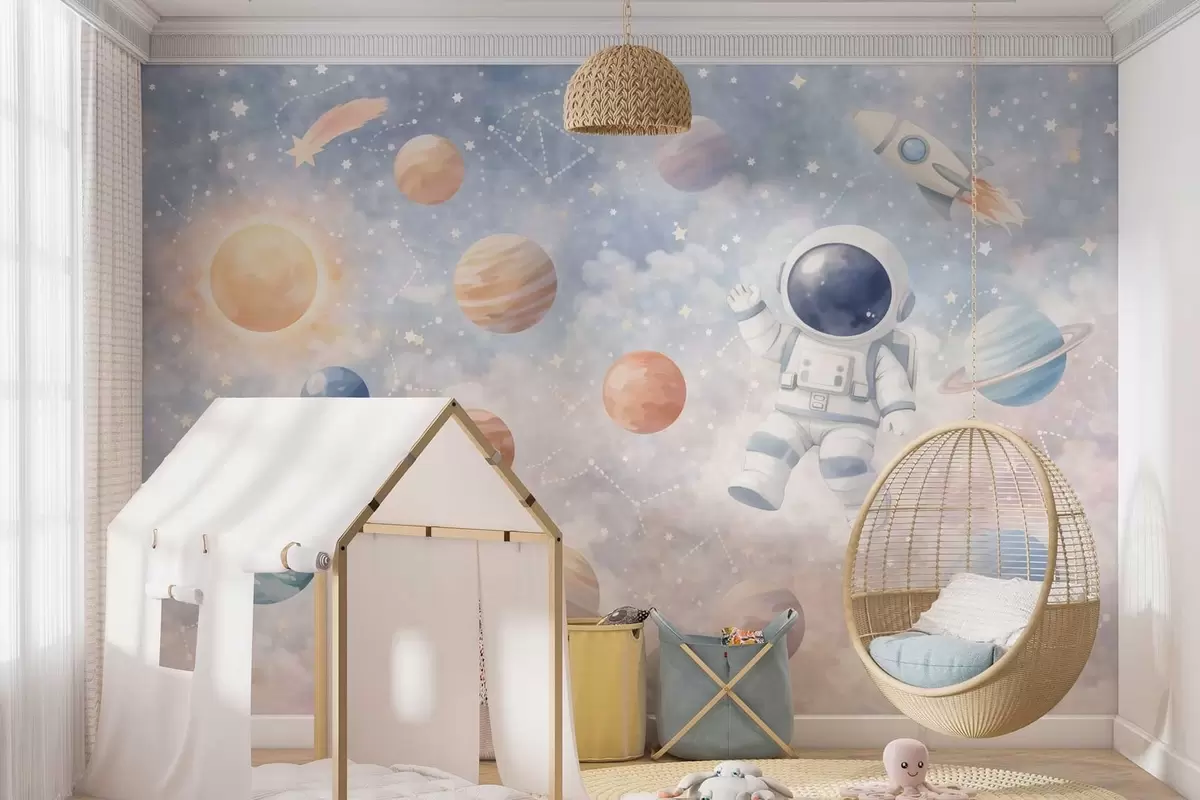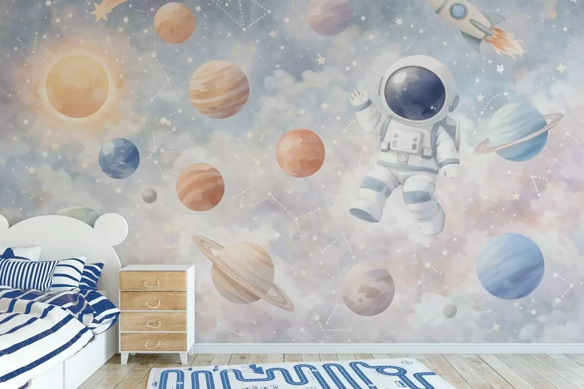 Fotobehang een kleine astronaut tussen planeten en sterren N° w05233