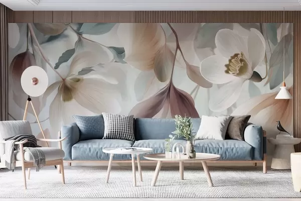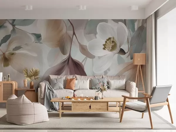 Fotobehang een verfijnde compositie van bloemen en bladeren in pasteltinten N° w05240