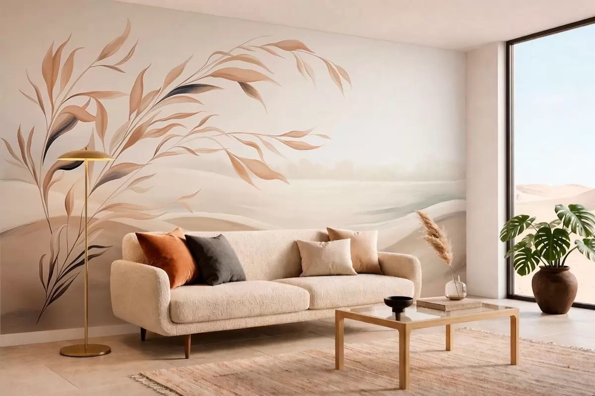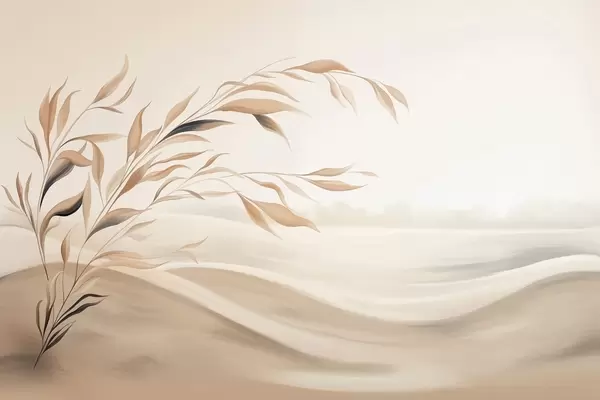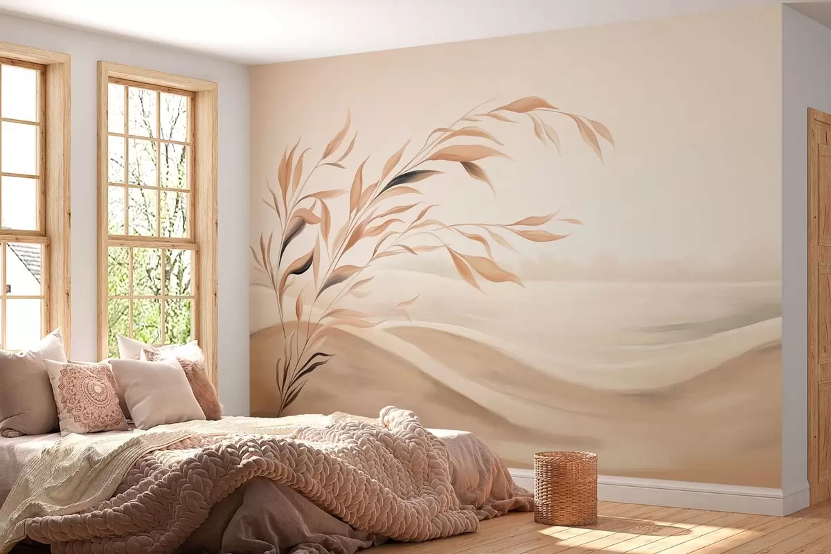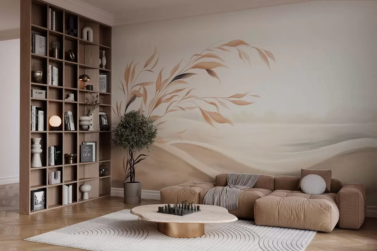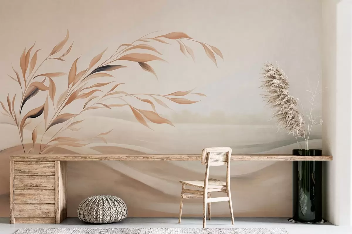 Fotobehang Een zacht landschap met een tak boven heuvels in lichtbeige tinten N° w05297