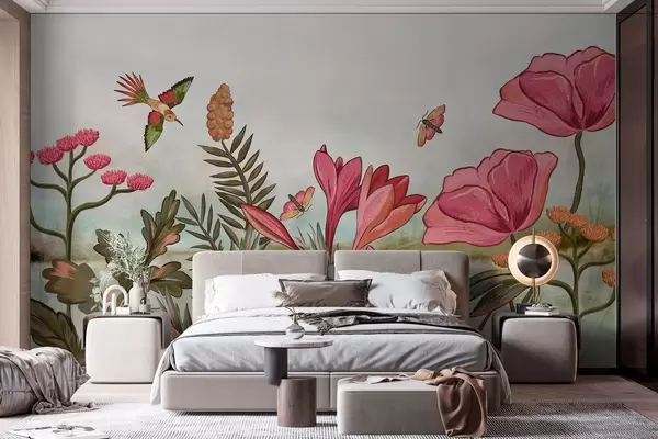 Fotobehang Heldere bloemen met vogels en vlinders N° w05321