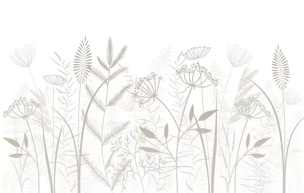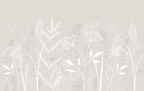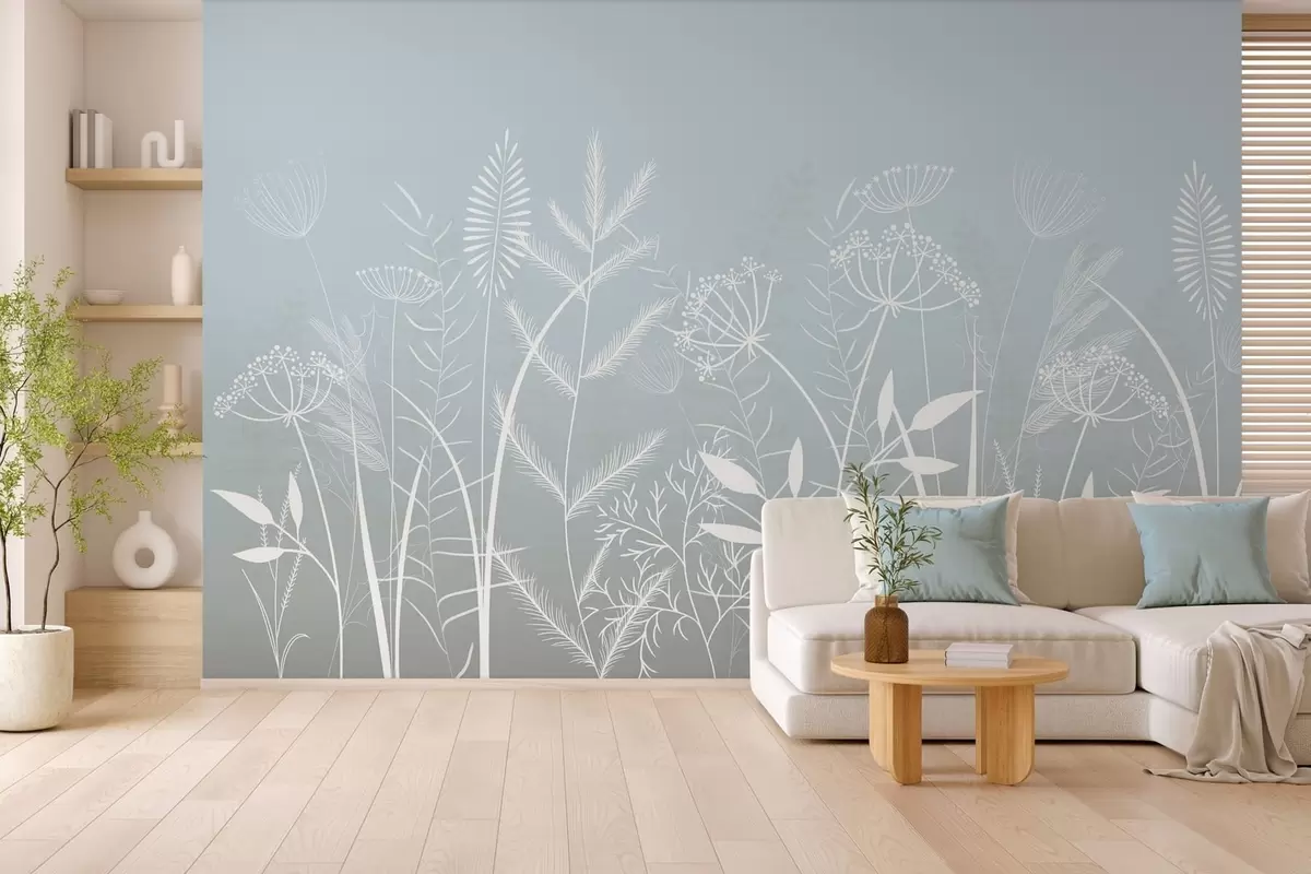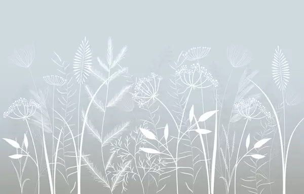 Fotobehang fijne, met de hand geschilderde wilde grassen en bloemen tegen een grijsblauwe achtergrond N° w05383