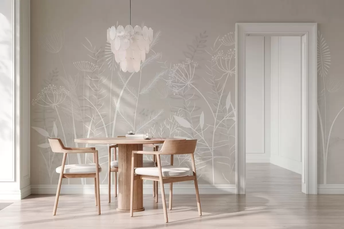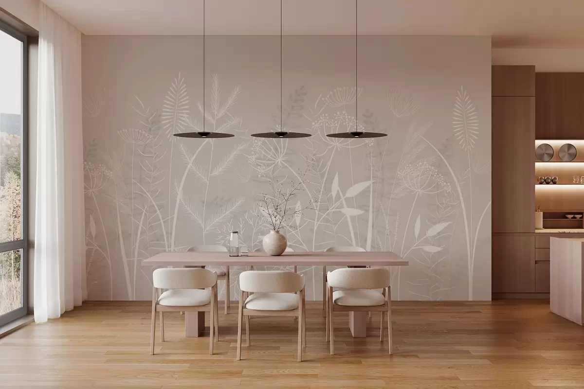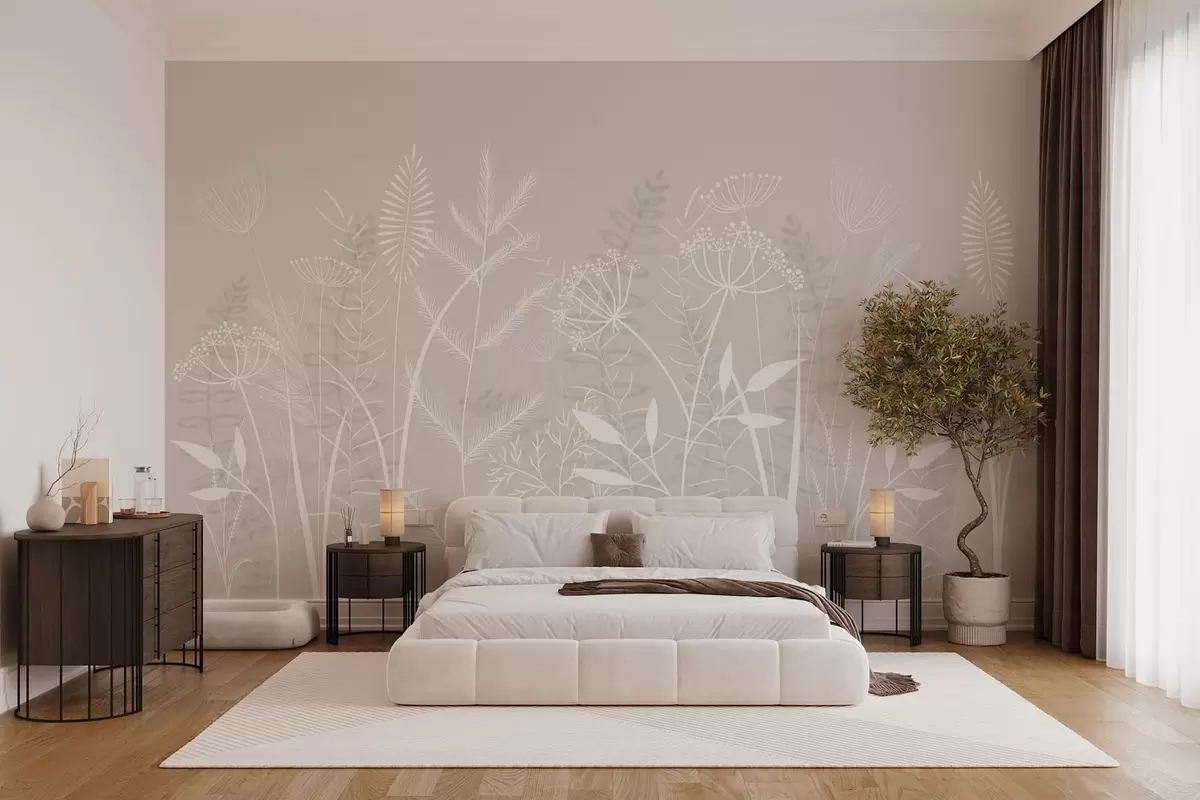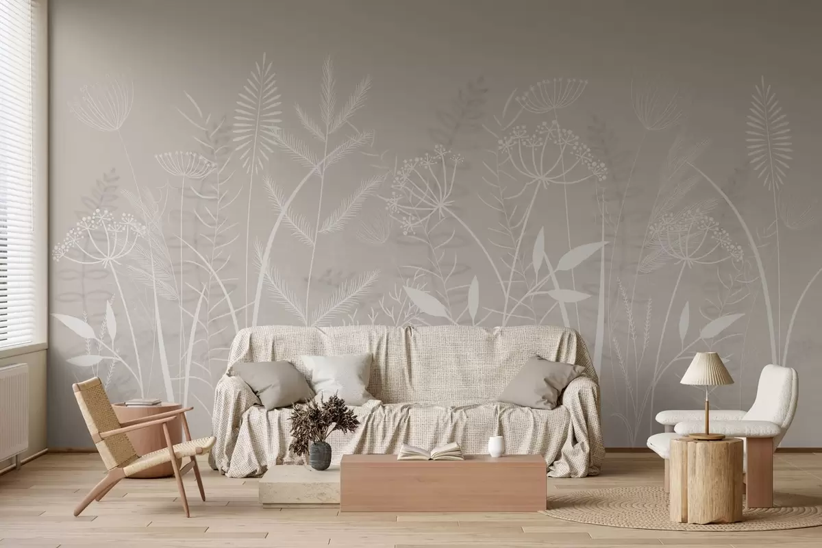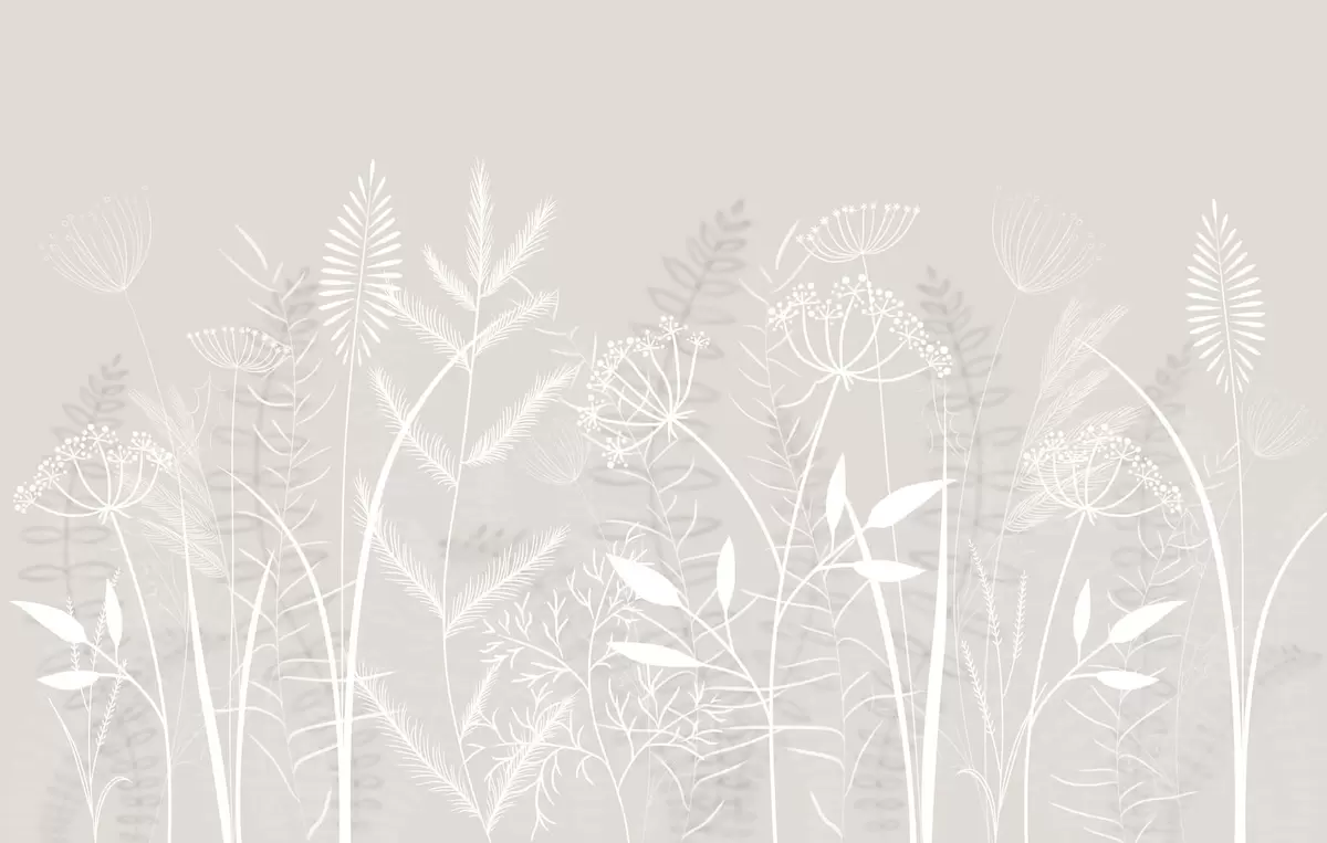 Fotobehang fijne, met de hand geschilderde wilde grassen en bloemen tegen een beige achtergrond N° w05383v1