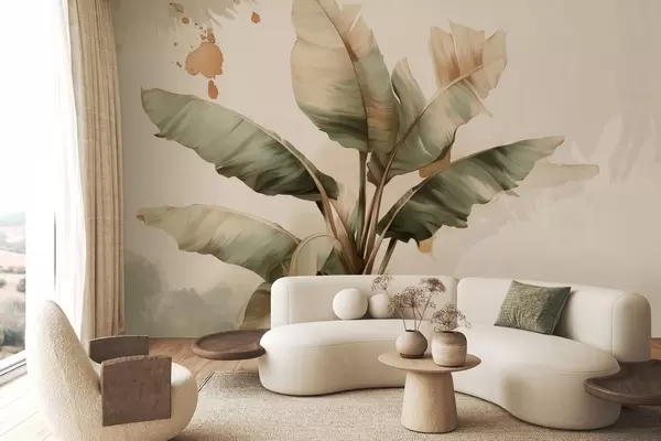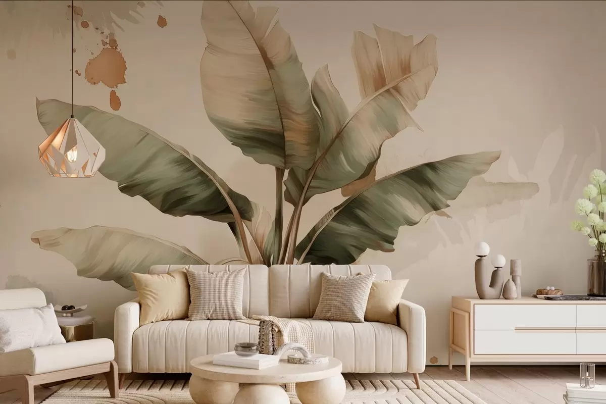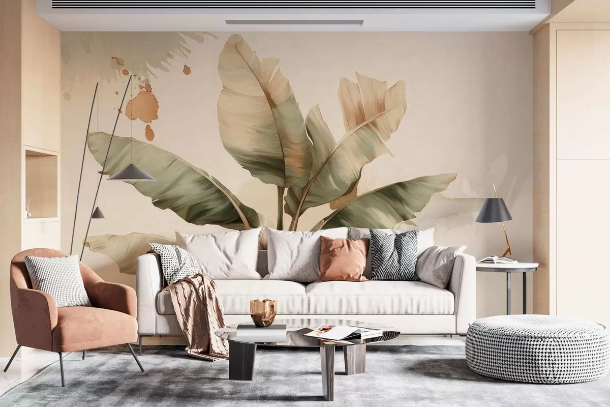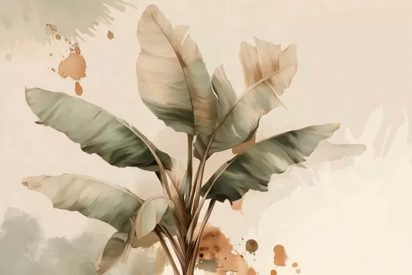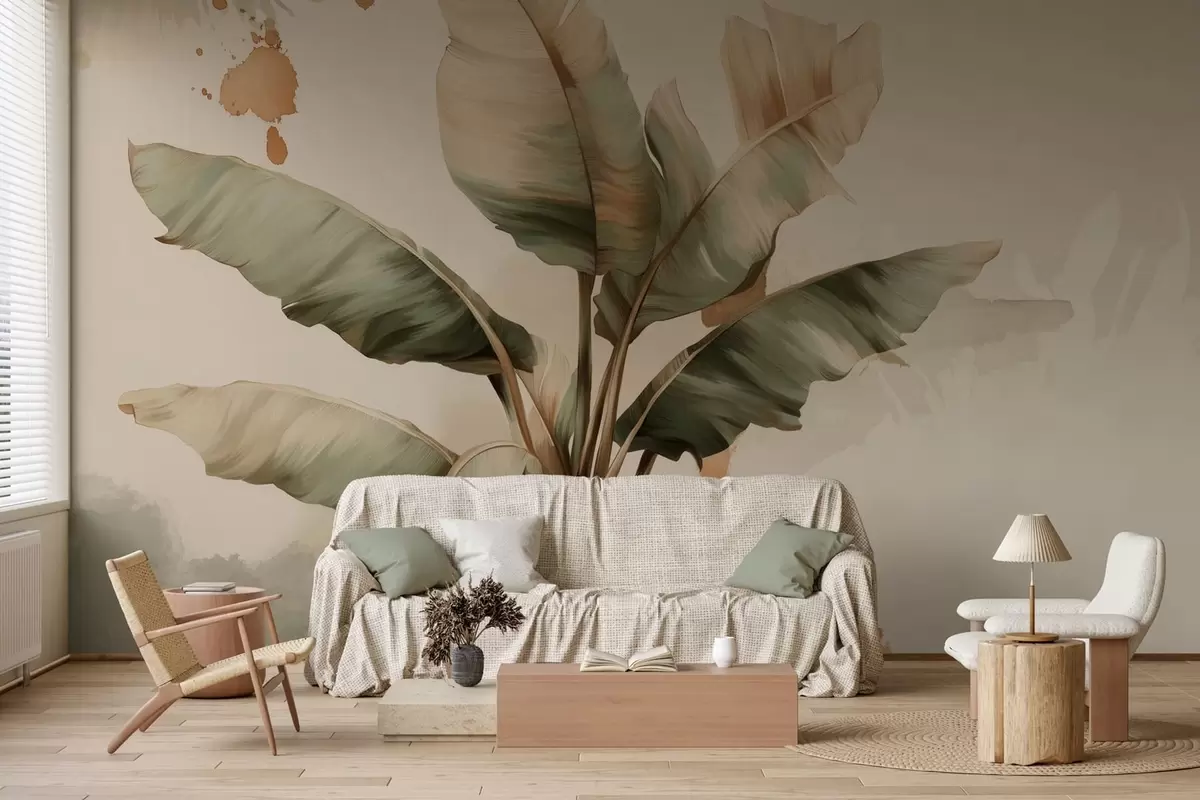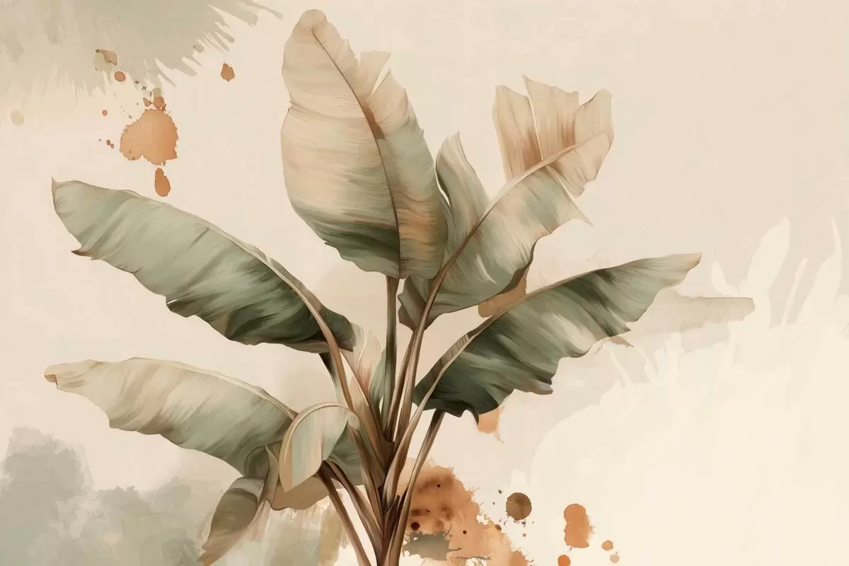 Fotobehang een grote, schilderachtige bos bananenbladeren met spatten in retrostijl N° w05384