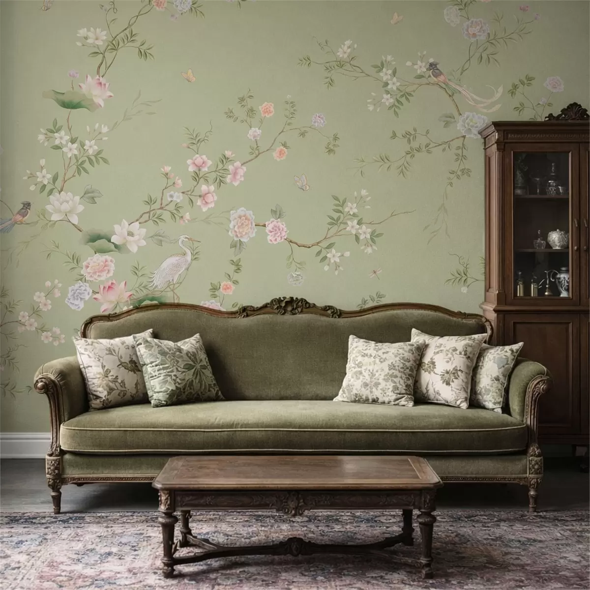 Fotobehang Bloeiende takken met vogels op lichtgroen N° w05416