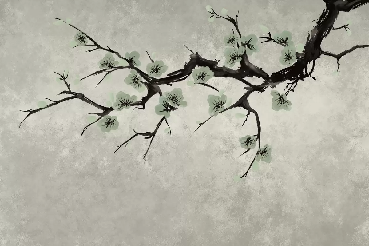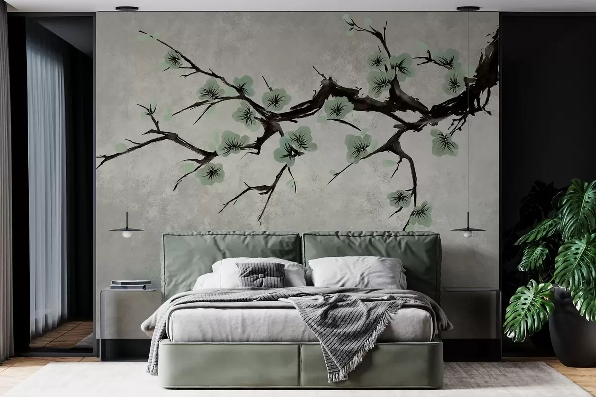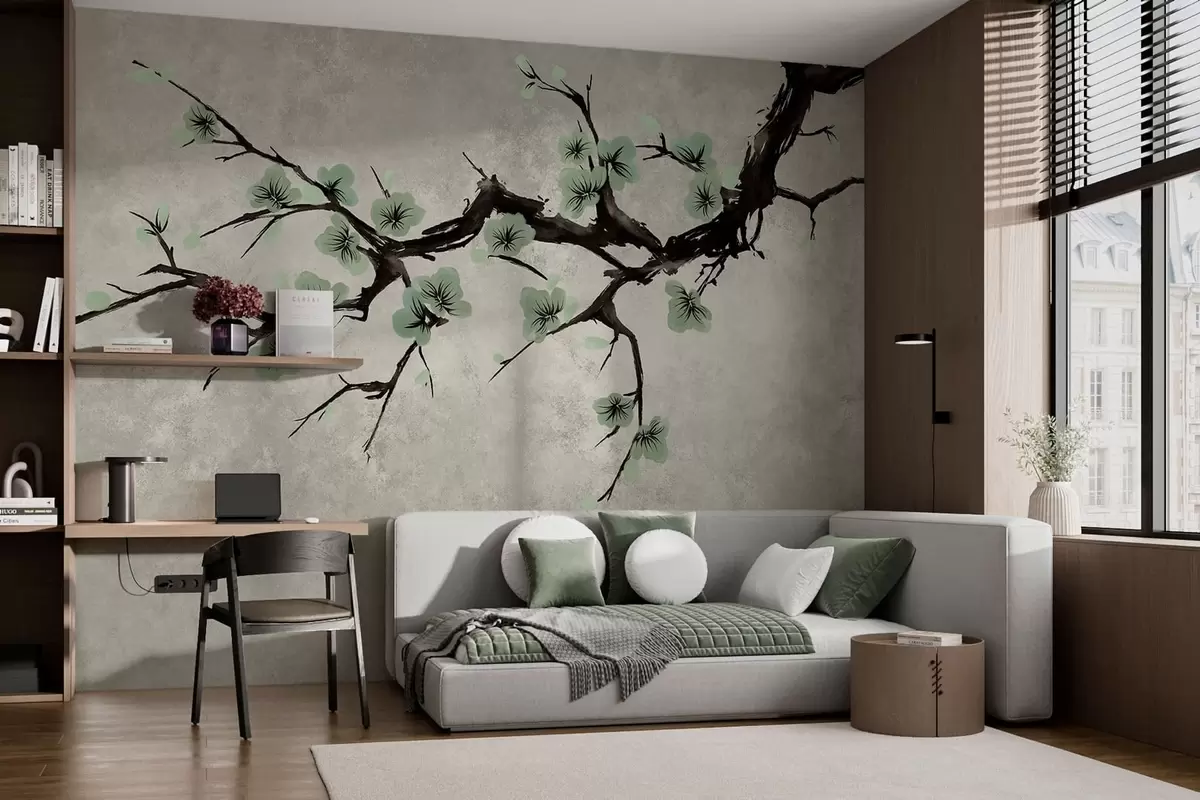 Fotobehang Tak met groene bloesems in rustige tinten N° w05425v2