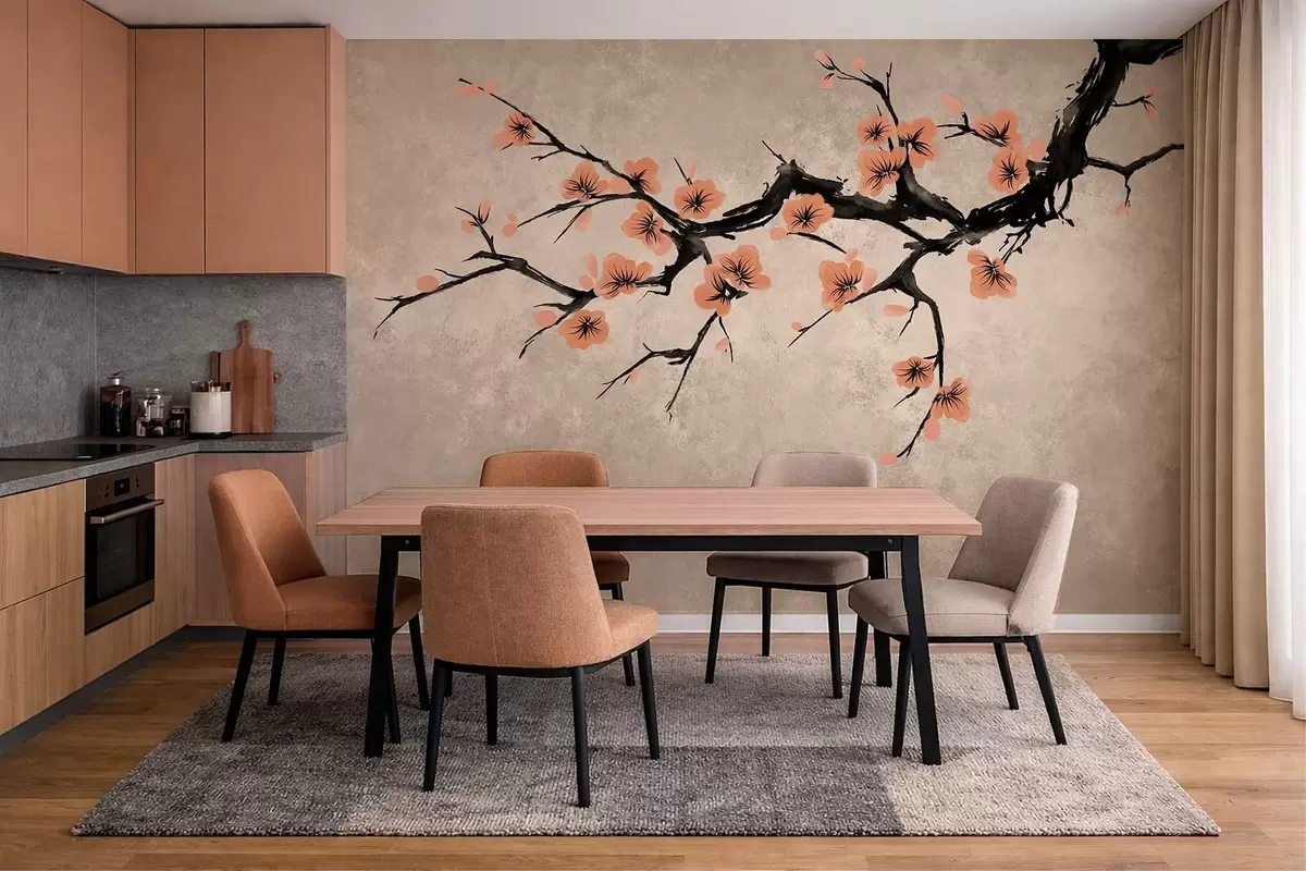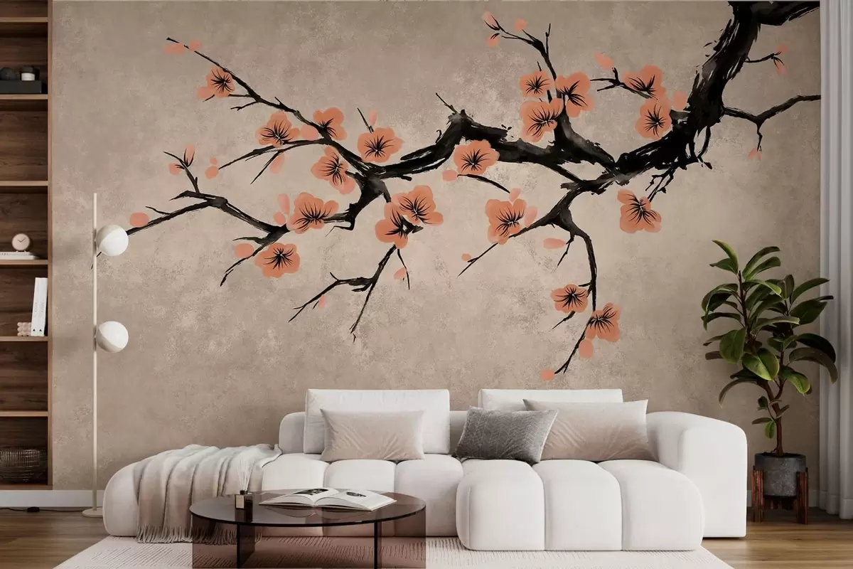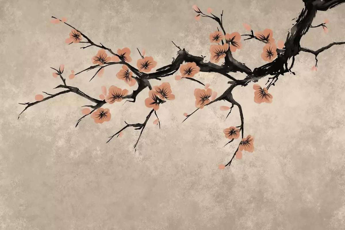 Fotobehang Tak met perzikbloesems op een gestructureerde achtergrond N° w05425v3