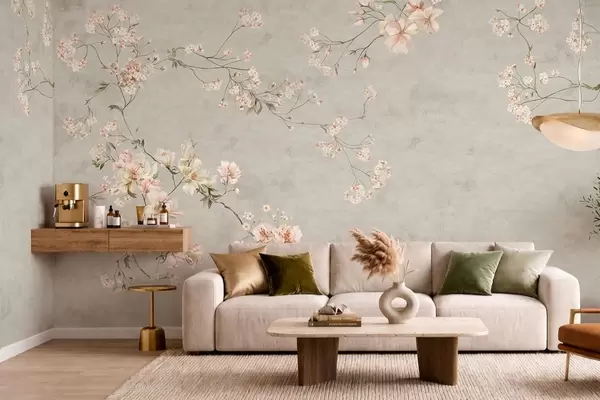 Fotobehang Bloemtakken in chinoiserie-stijl op een grijze achtergrond N° w05427v1