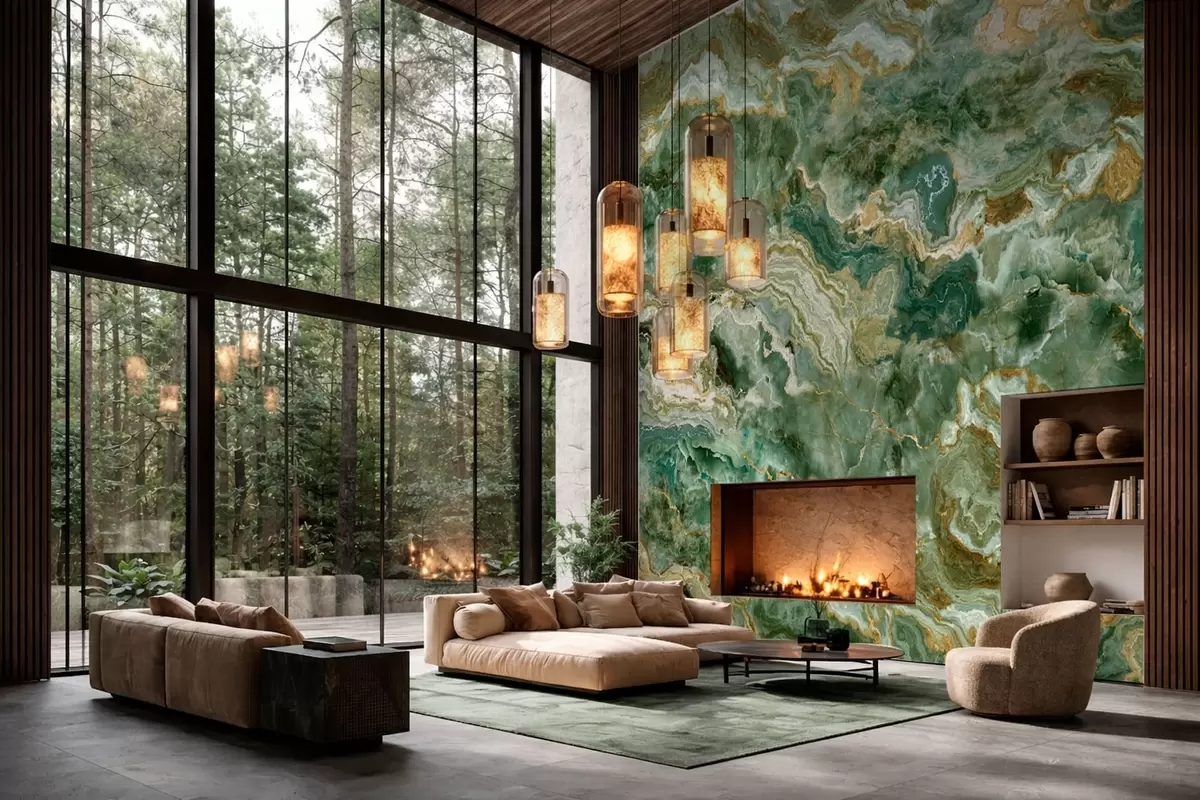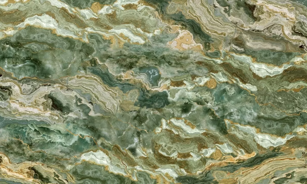 Fotobehang Groene onyxtextuur met vloeiende, gelaagde aders N° w05429