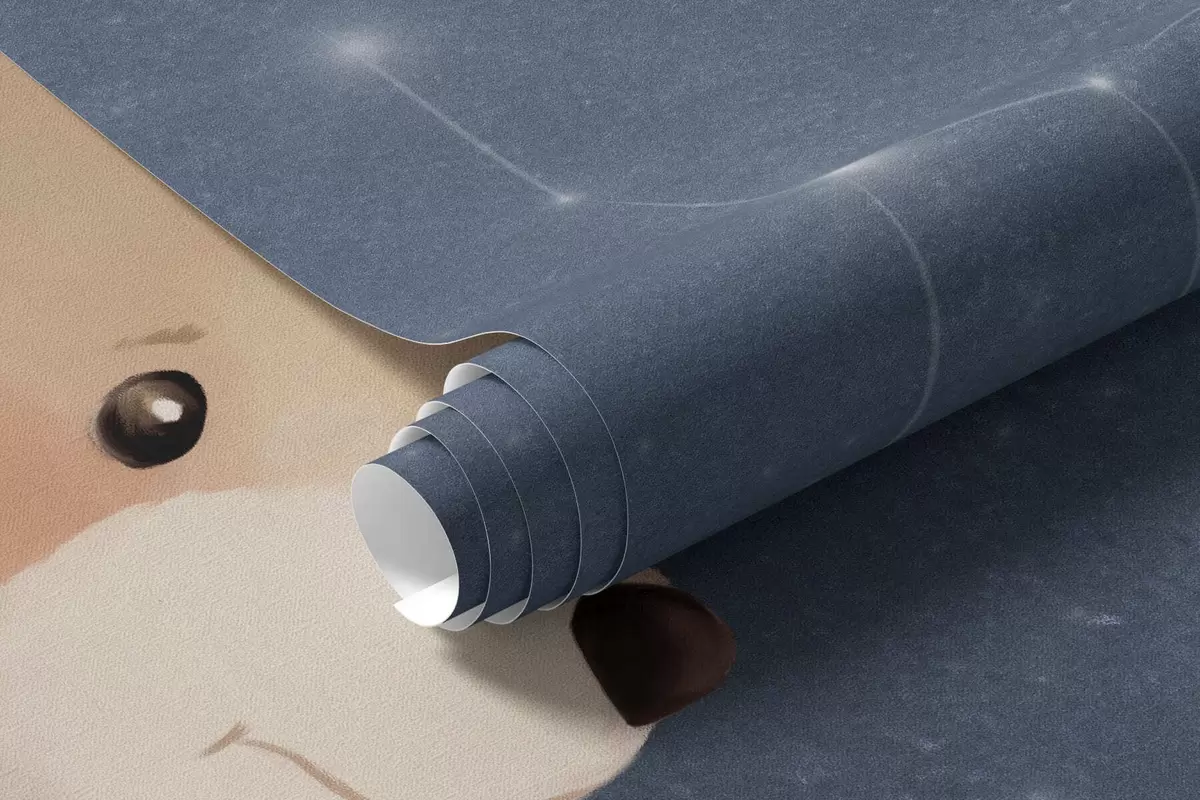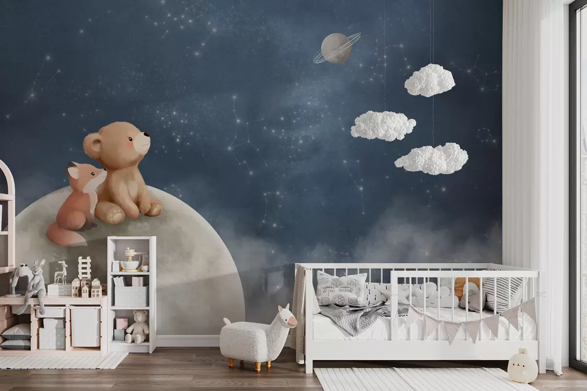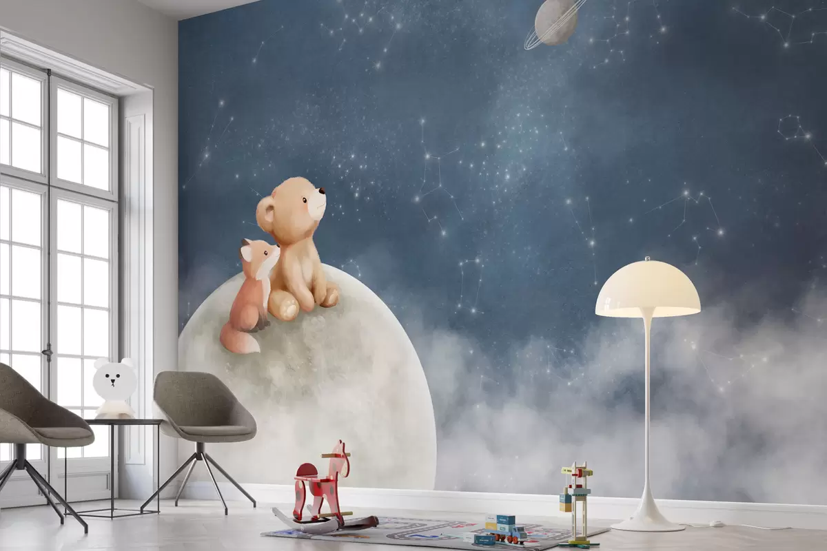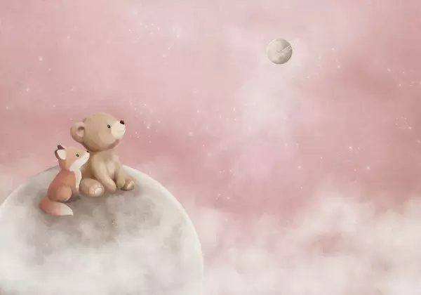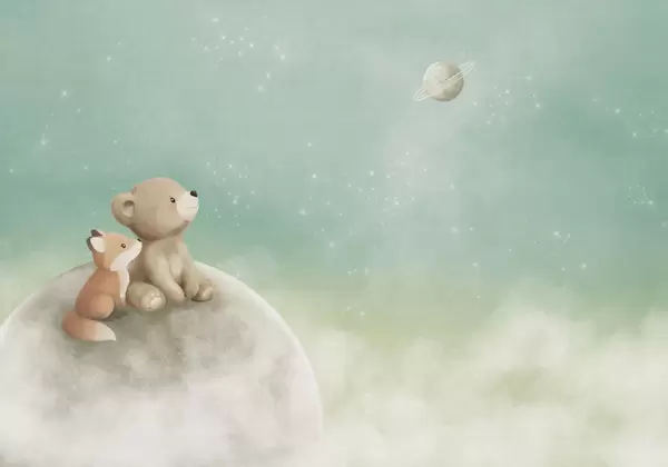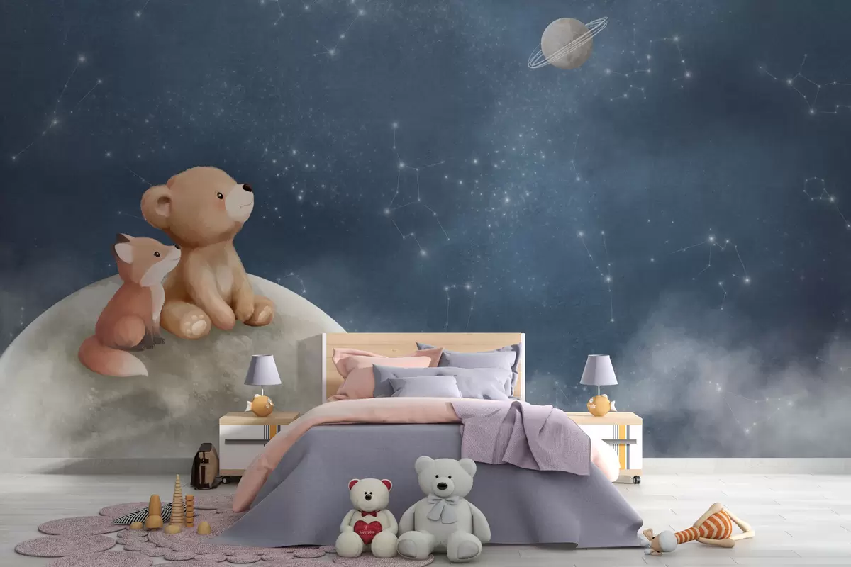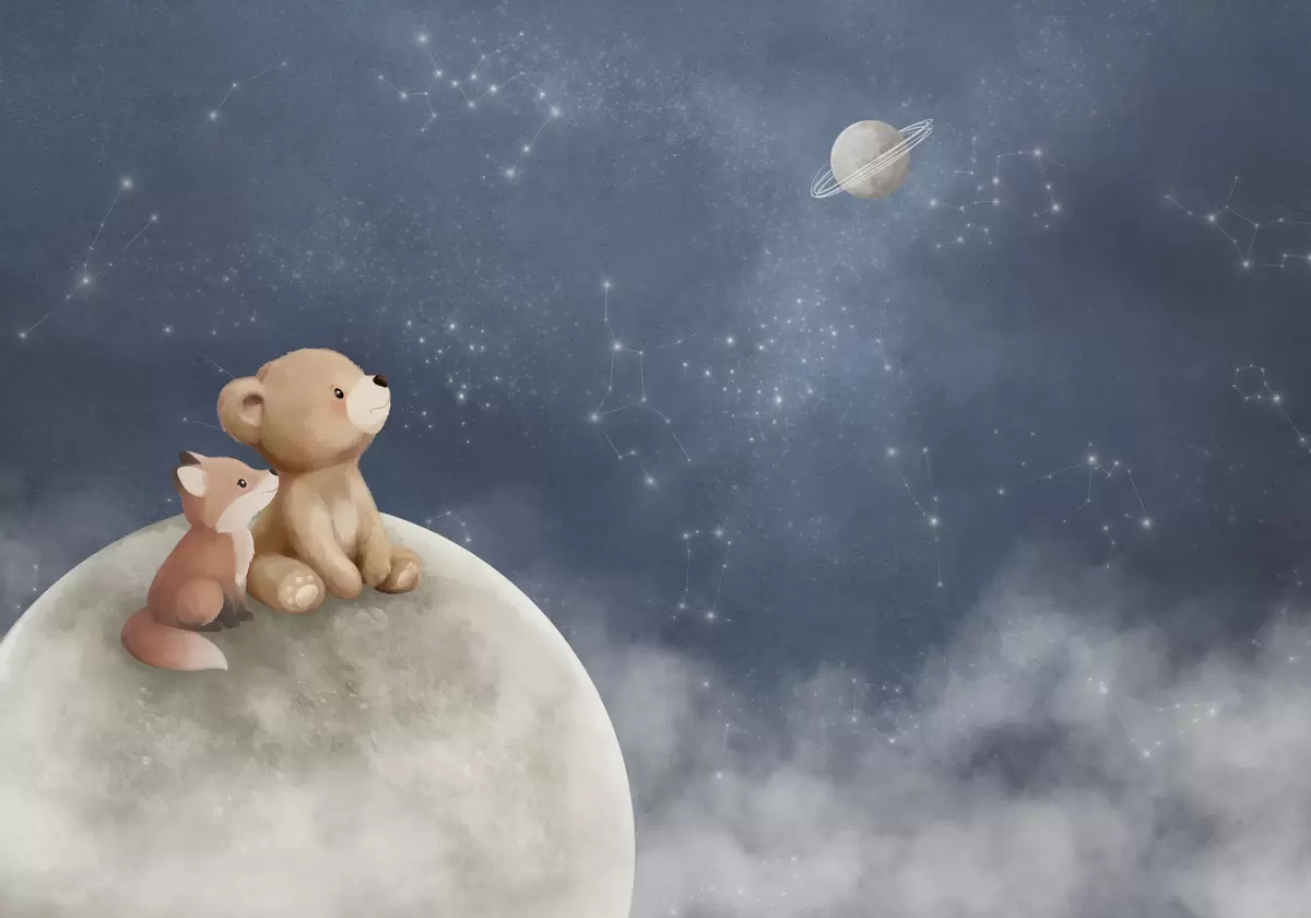 Fotobehang Pastelillustratie van een beer en een vos tegen een nachtelijke hemel N° w05431