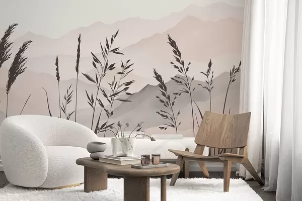 Fotobehang Gras silhouetten tegen de achtergrond van de bergen N° w05501
