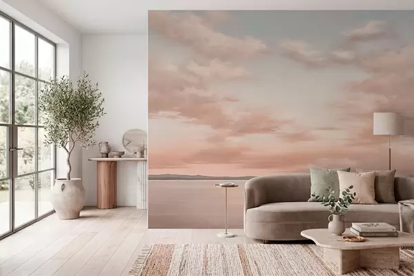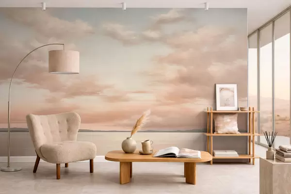 Fotobehang Minimalistische zeehorizon met pastelkleurige wolken N° w05516