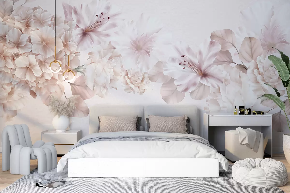 Fotobehang Zachtroze en witte bloemenarrangement, met delicate bloemblaadjes en bloesems tegen een lichte achtergrond N° w07923