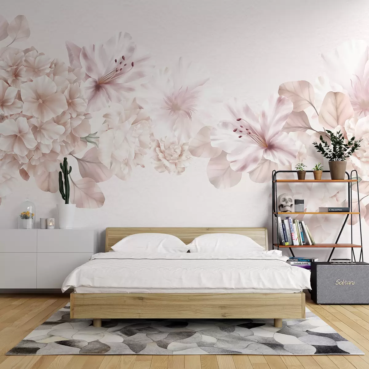 Fotobehang Zachtroze en witte bloemenarrangement, met delicate bloemblaadjes en bloesems tegen een lichte achtergrond N° w07923