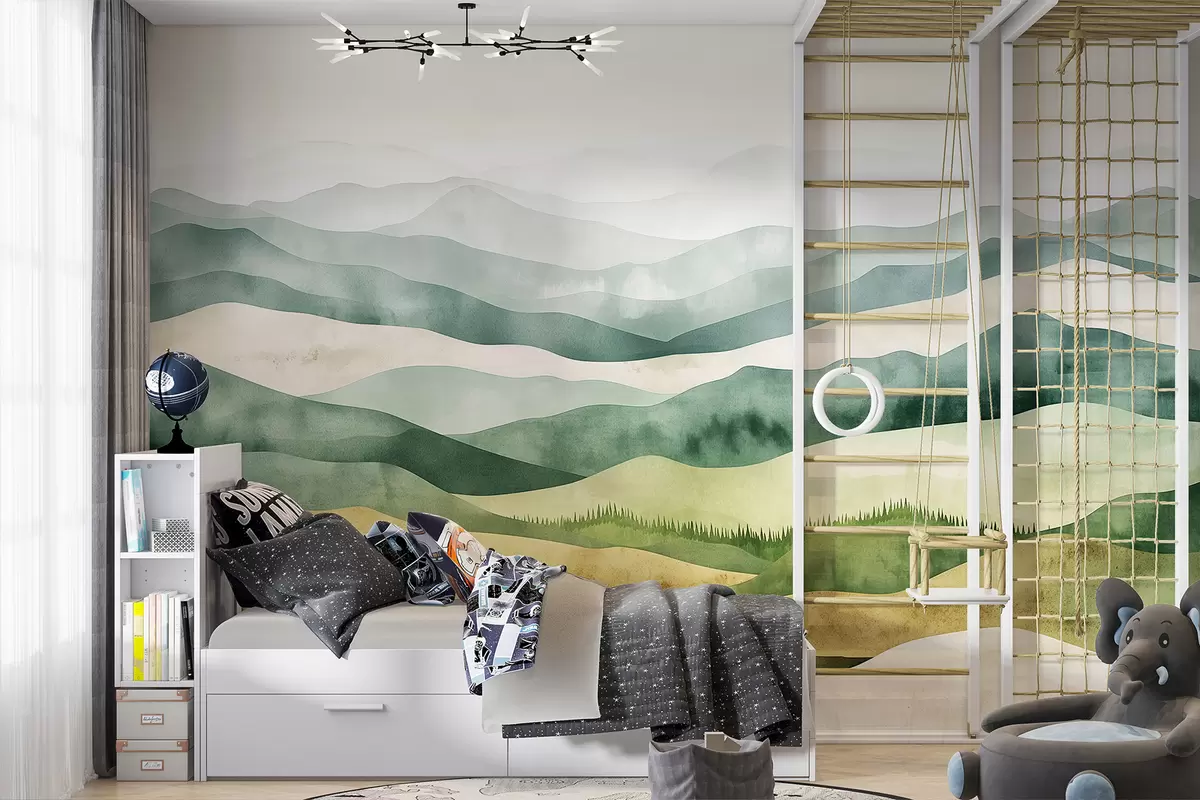 Fotobehang Aquarel berglandschappen, bos, natuurlijke groene en beige kleuren N° w07950