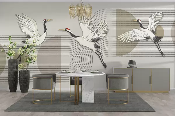 Fotobehang Drie witte kraanvogels in vlucht tegen een geometrische minimalistische achtergrond met concentrische cirkels w08188