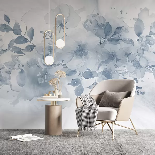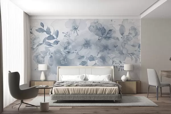 Fotobehang Zacht, wazig bloemenpatroon in tinten grijs en wit, met delicate bloemen en bladeren N° w08189