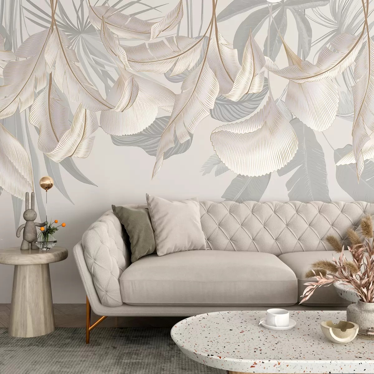 Fotobehang Delicate witte en grijze tropische bloemenbladeren creëren een zachte, etherische achtergrond N° w08217