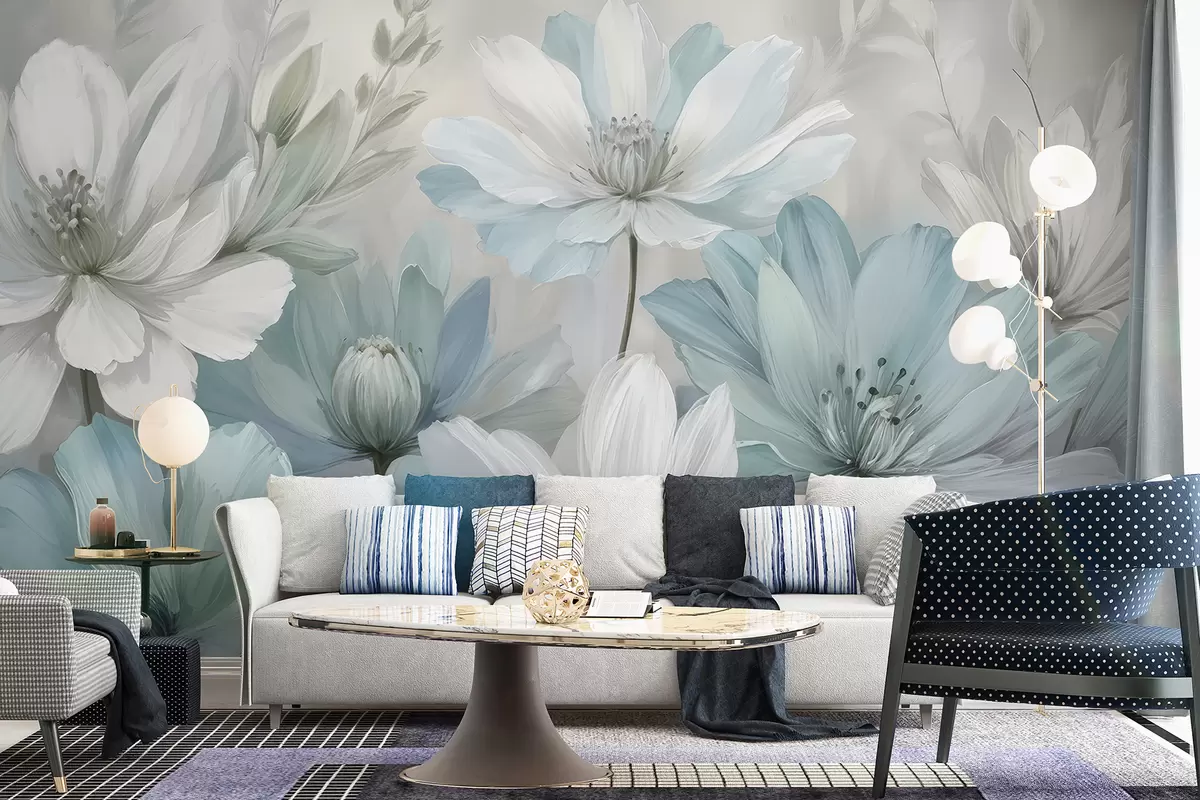 Fotobehang Een close-up van witte en lichtblauwe madeliefachtige bloemenschilderkunst met zachte, wazige achtergronden N° w08247