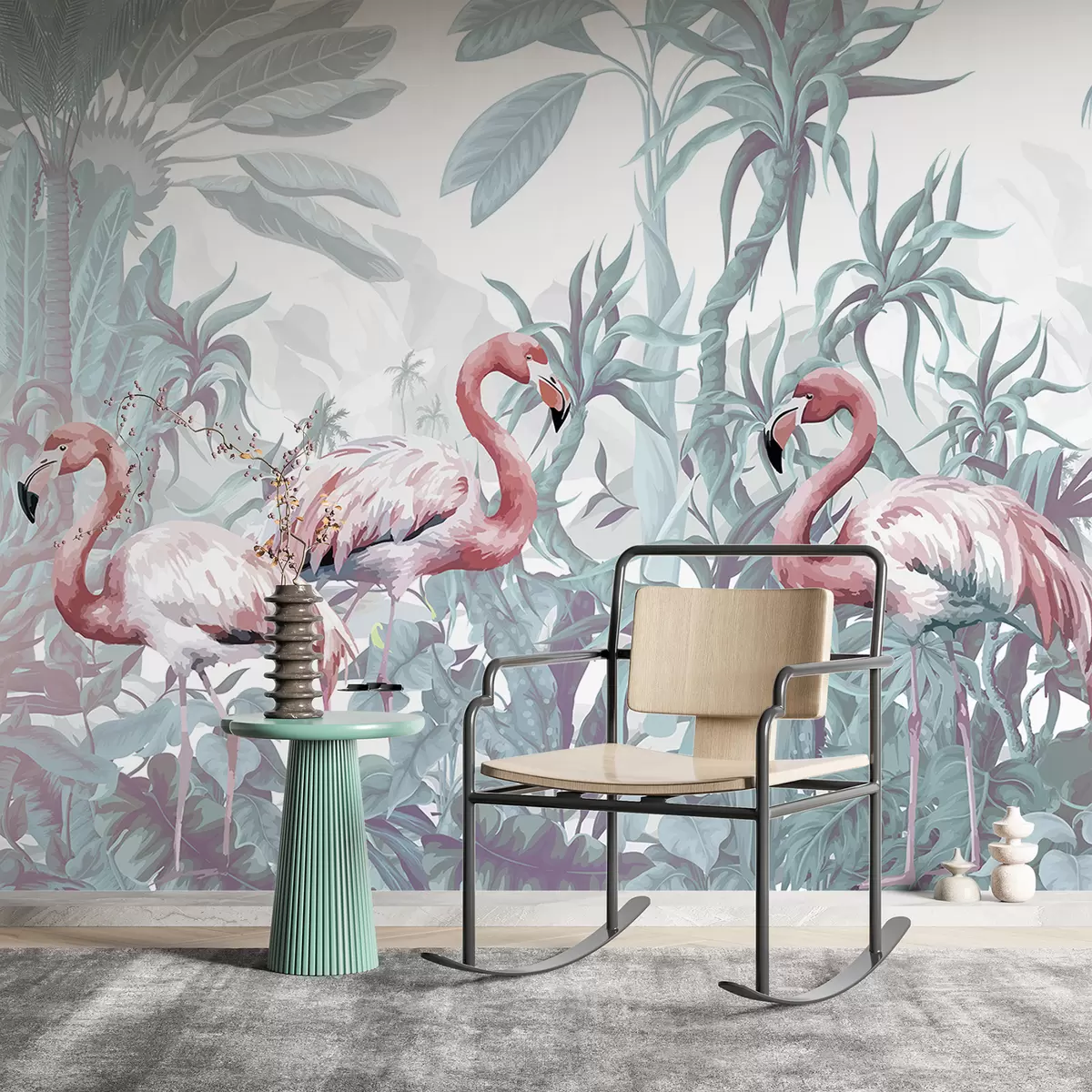 Fotobehang Roze flamingo's in een weelderig, tropisch bladerdek met grote palmbladeren en bloemen in groen- en wittinten N° w08250v1
