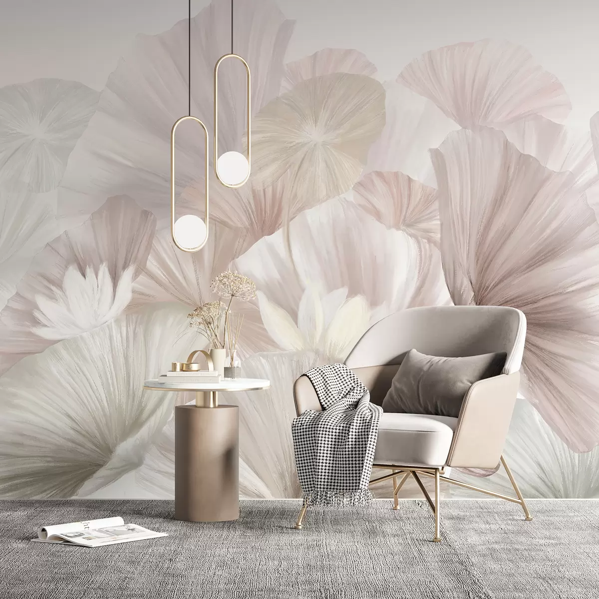 Fotobehang Delicate roze lotusblaadjes met witte bloemen met zachte, vederlichte bloemblaadjes, gerangschikt in een natuurlijke kunstcompositie N° w08265v1